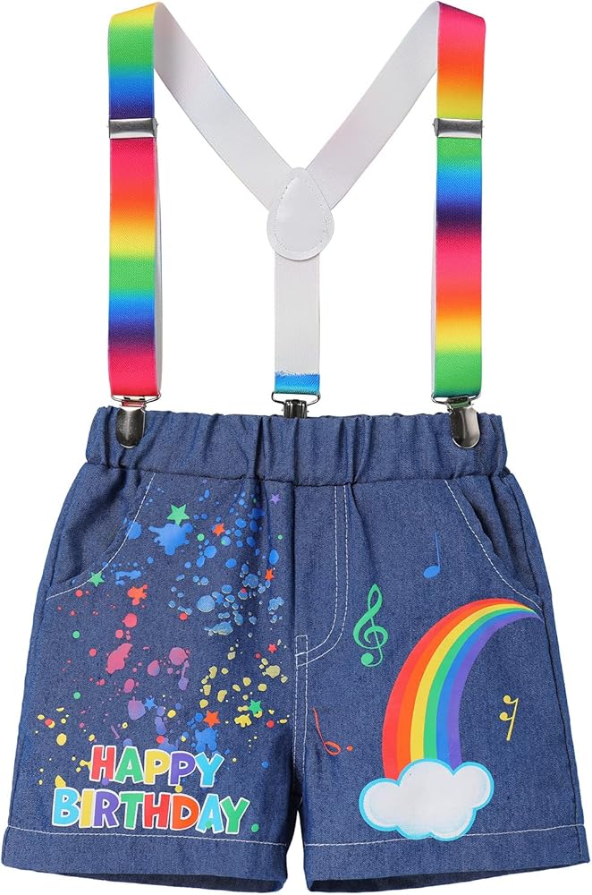 Package Include: 1PC Romper or 1PC Birthday Shirt + 1PC Suspenders + 1 Pair of Jeans Bloomers Pants + 1PC Rainbow Birthday Hat