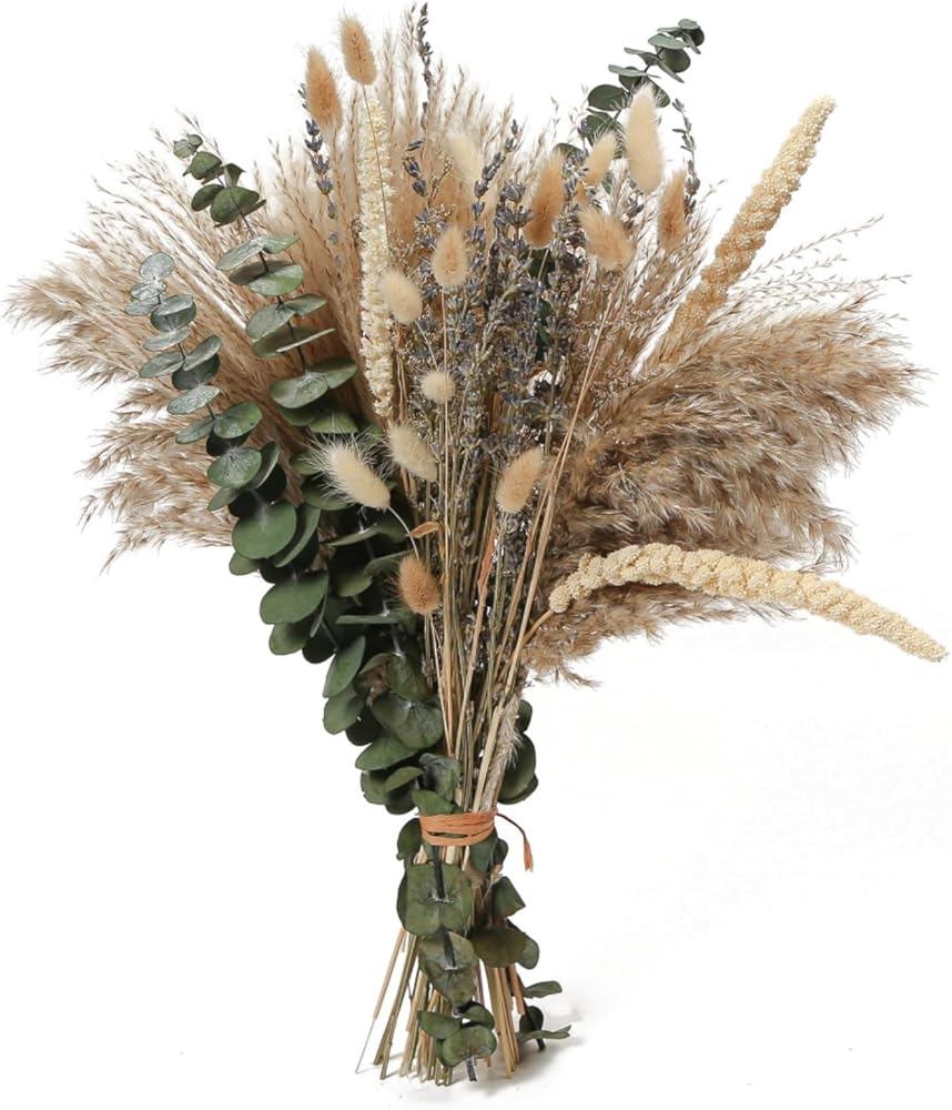 🌿Unique Bouquet ---Our natural dried flowers bouquet mix with 7 dried plants and grasses in different shapes, sizes, textures, and colors. The dried eucalyptus and pompas grass are particularly great for floral enthusiasts to setting up your own arrangement space at home. we'll note that the dried bunches and stems do not disappoint. Whether your style leans subdued, colorful, or a bit boho, there truly are options for everyone.