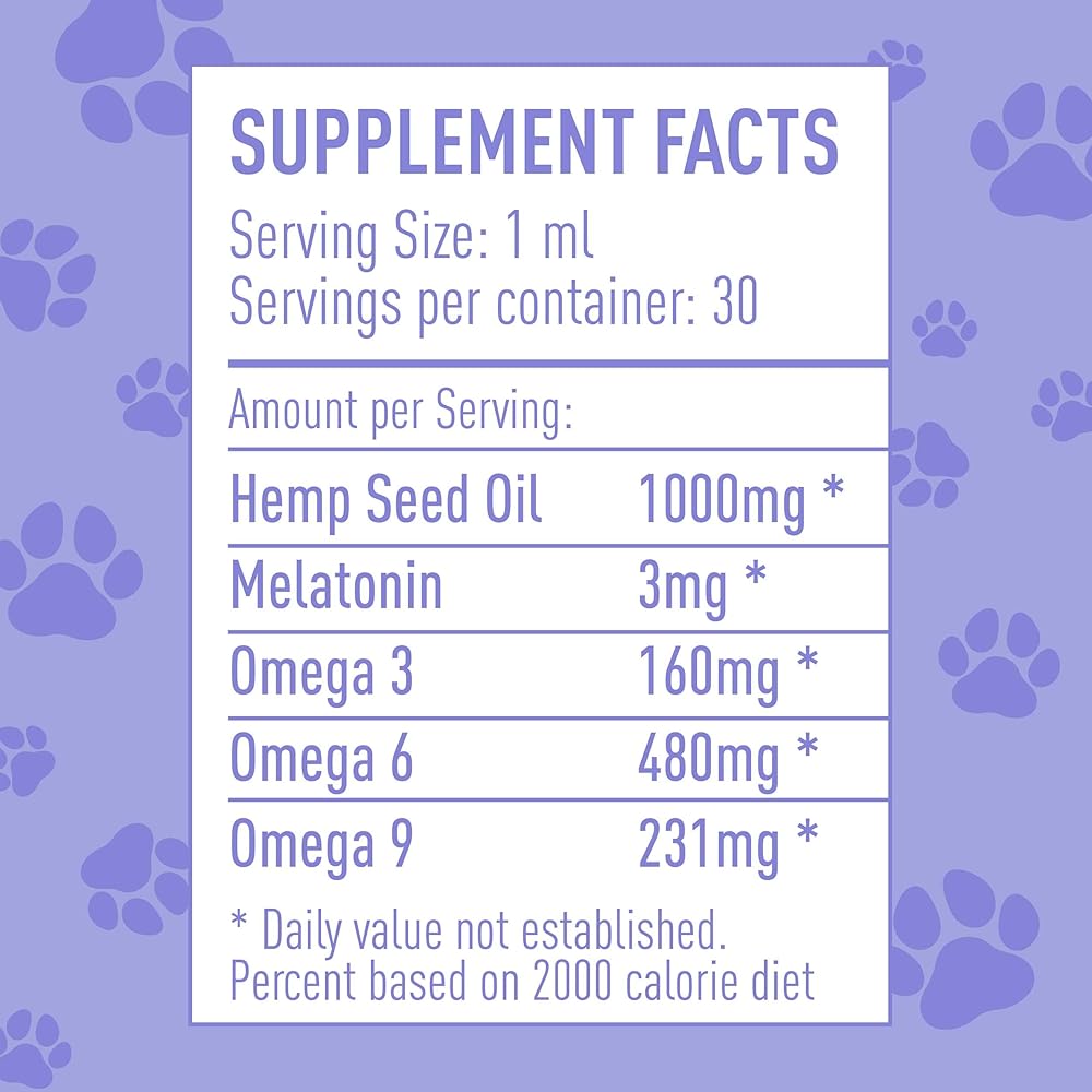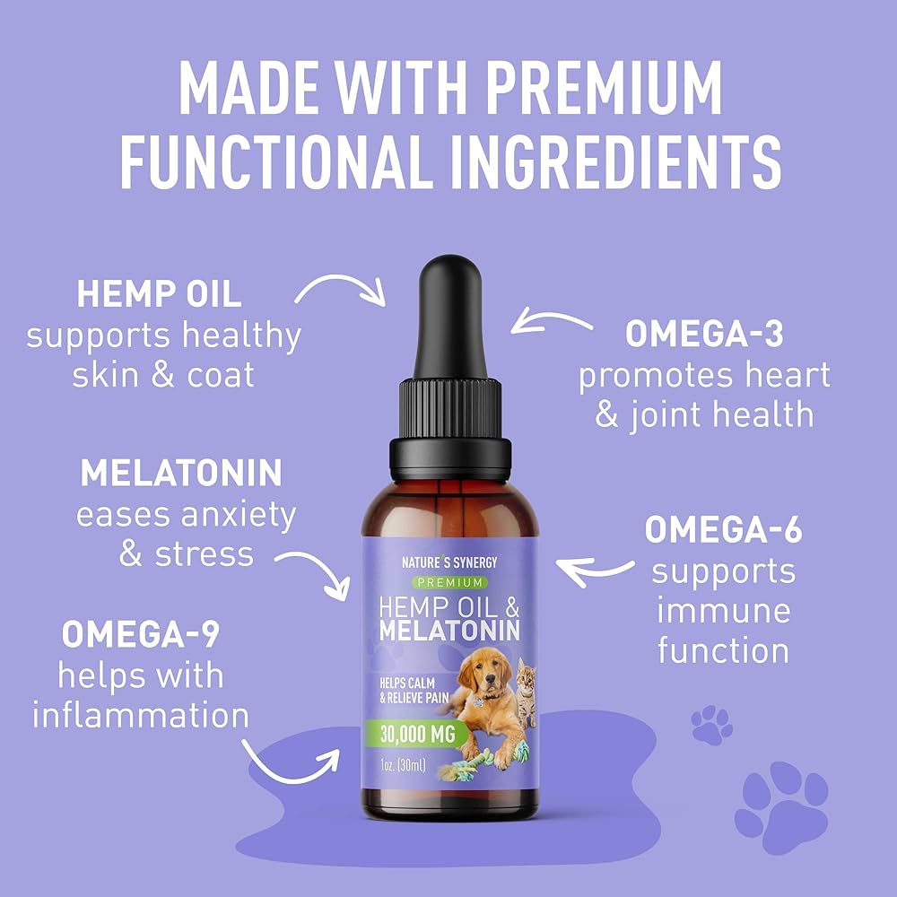 Nature's Synergy Melatonin and Hemp Oil for Dogs, Cats & Pets, Calming Sleep Support, Omega Fatty Acids for Hip and Joint Support, Skin and Coat Health, Stress from Travel, Separation, 1 Oz