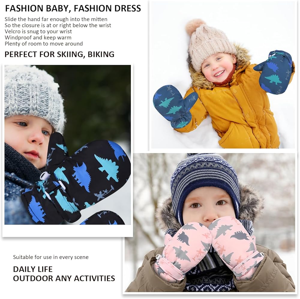 Gloves specially designed for babies,toddlers, little boys and girls.the toddler mittens are designed with extra long hook and loop adjustable closure, can be adjusted according to your child's wrist size to prevent falling off of baby and little kids hands,easy to put on and stays on.