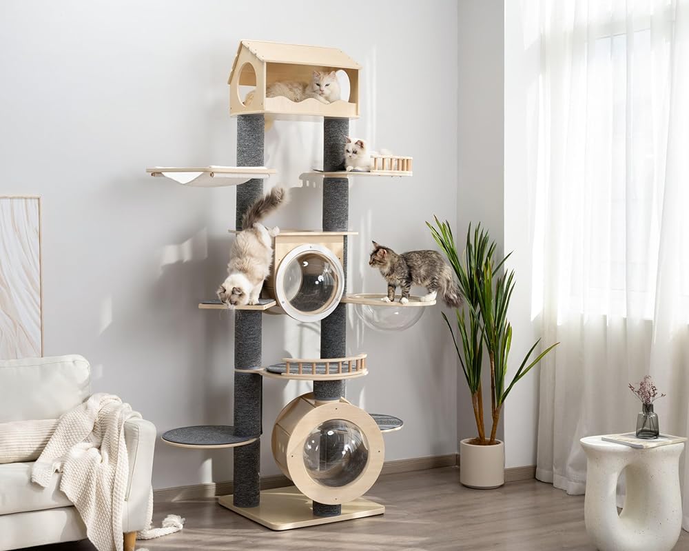 【Sturdy, Stable, Safe】Well-balanced design, stable construction, strong solid wood material, heavy weight, plus an optional component fixed to the wall. Even though this cat tower is over 85 inches high and close to 100 pounds, it won't topple over or fall apart. No matter how many naughty playful cats there are, will never stop it standing for decades.