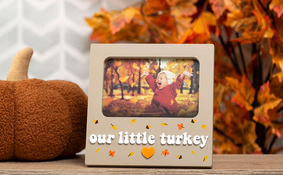 Celebrate your baby's first Thanksgiving with Reece Studio's Our Little Turkey Photo Frame, featuring festive leaves and 3D words "Our Little Turkey" to commemorate this special milestone