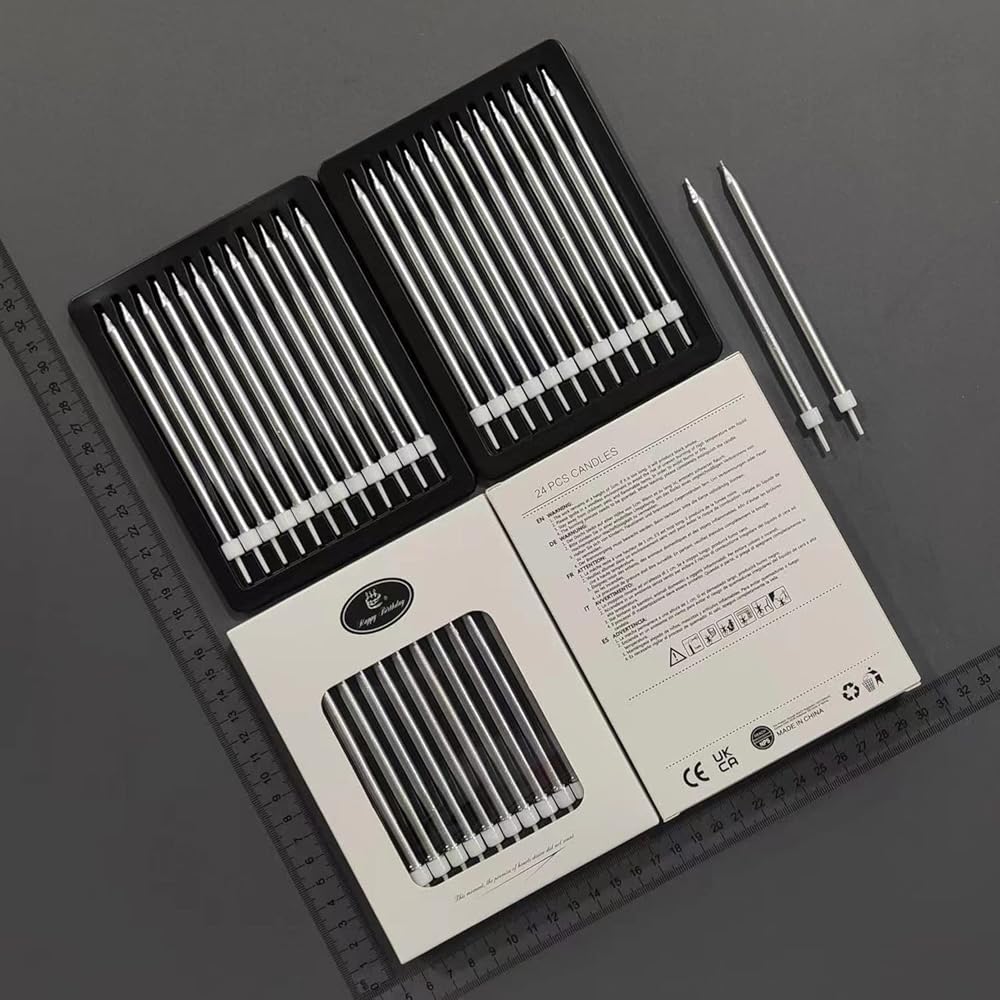 【Count & Dimensions】 24Pcs Candles (2 Candles Packs). Each Candle Dimensions(Length x Width): 5.1 x 0.24 Inches