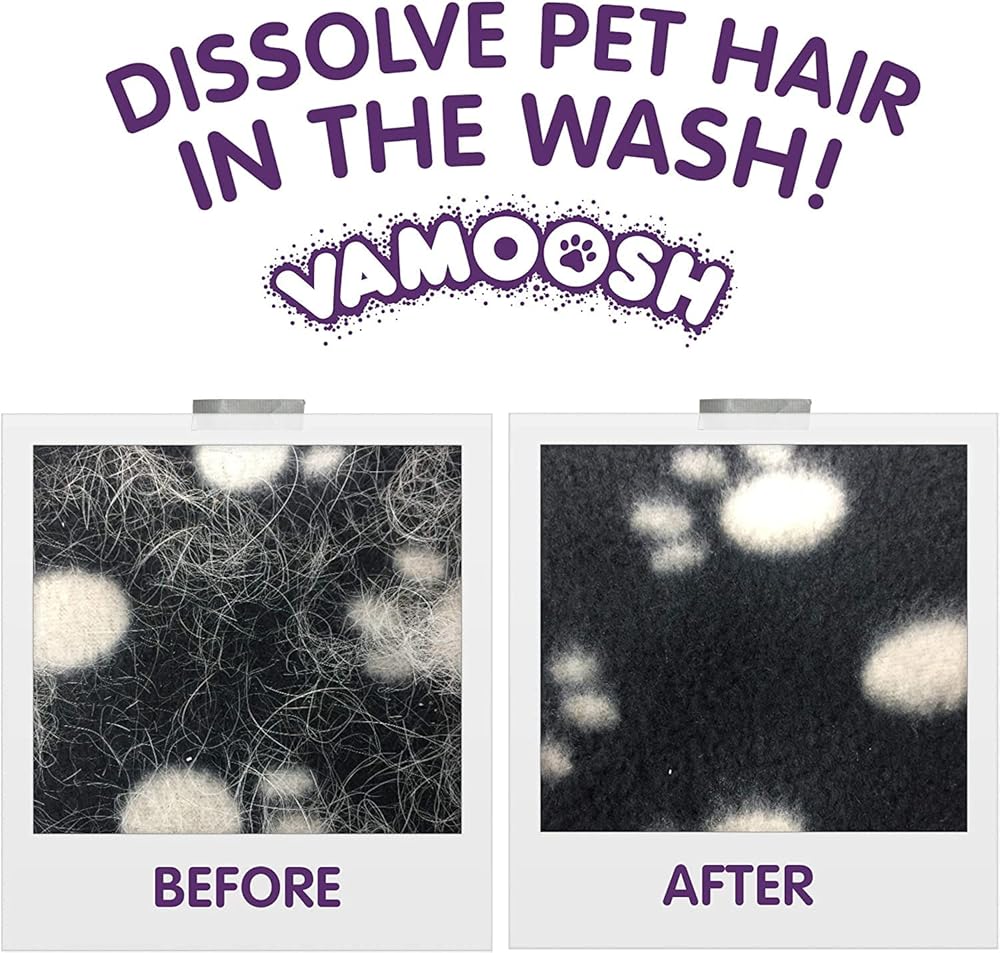 WASHING MACHINE PET FUR REMOVER - Vamoosh pet hair remover for laundry dissolves pet hair, leaving your pet's bedding and your machine hair-free and squeaky clean. Use alone or with bedding to remove hair from your machine and prevent blockages