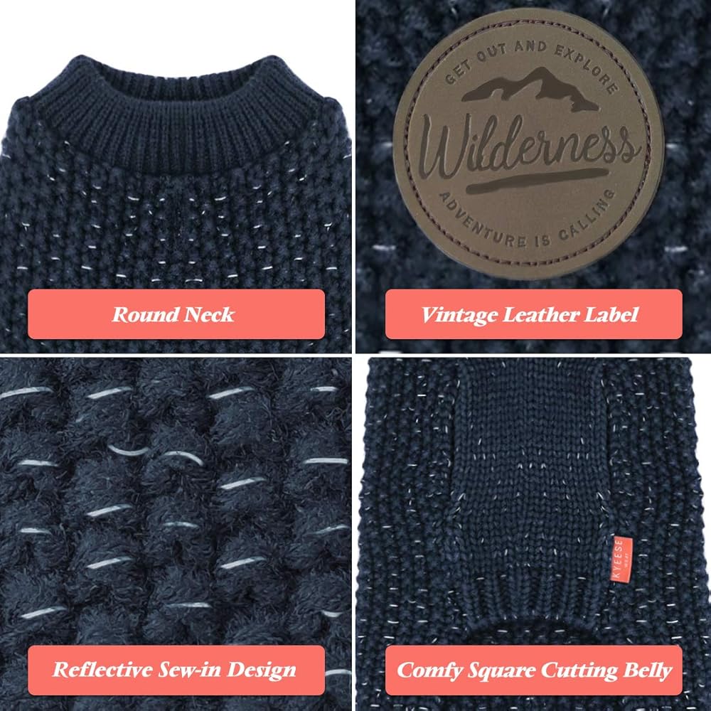 KYEESE Dog Sweater with Leash Hole for Small Dogs Male Warm Pullover with Reflective Thread Soft Knitwear Boy Dog Clothes Cozy Lightweight Thick Sweater Pet Indoor Outdoor Wear,Navy Blue,X-Small