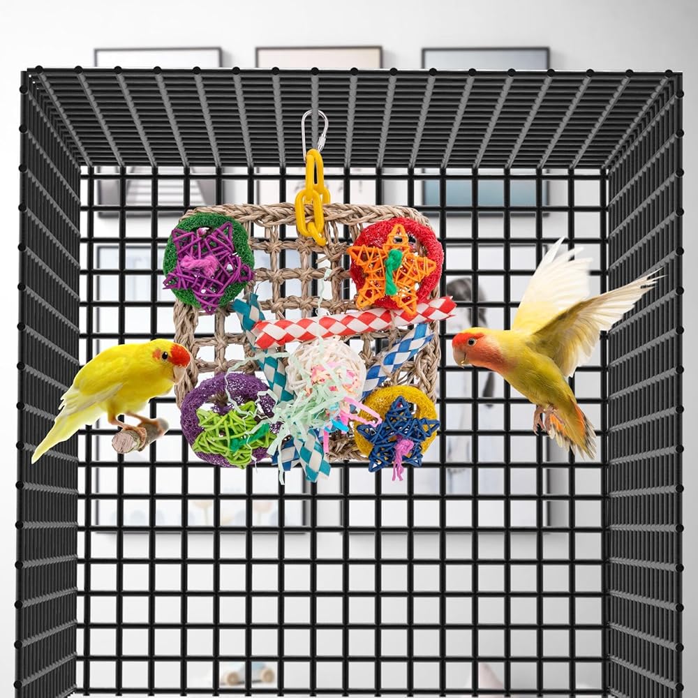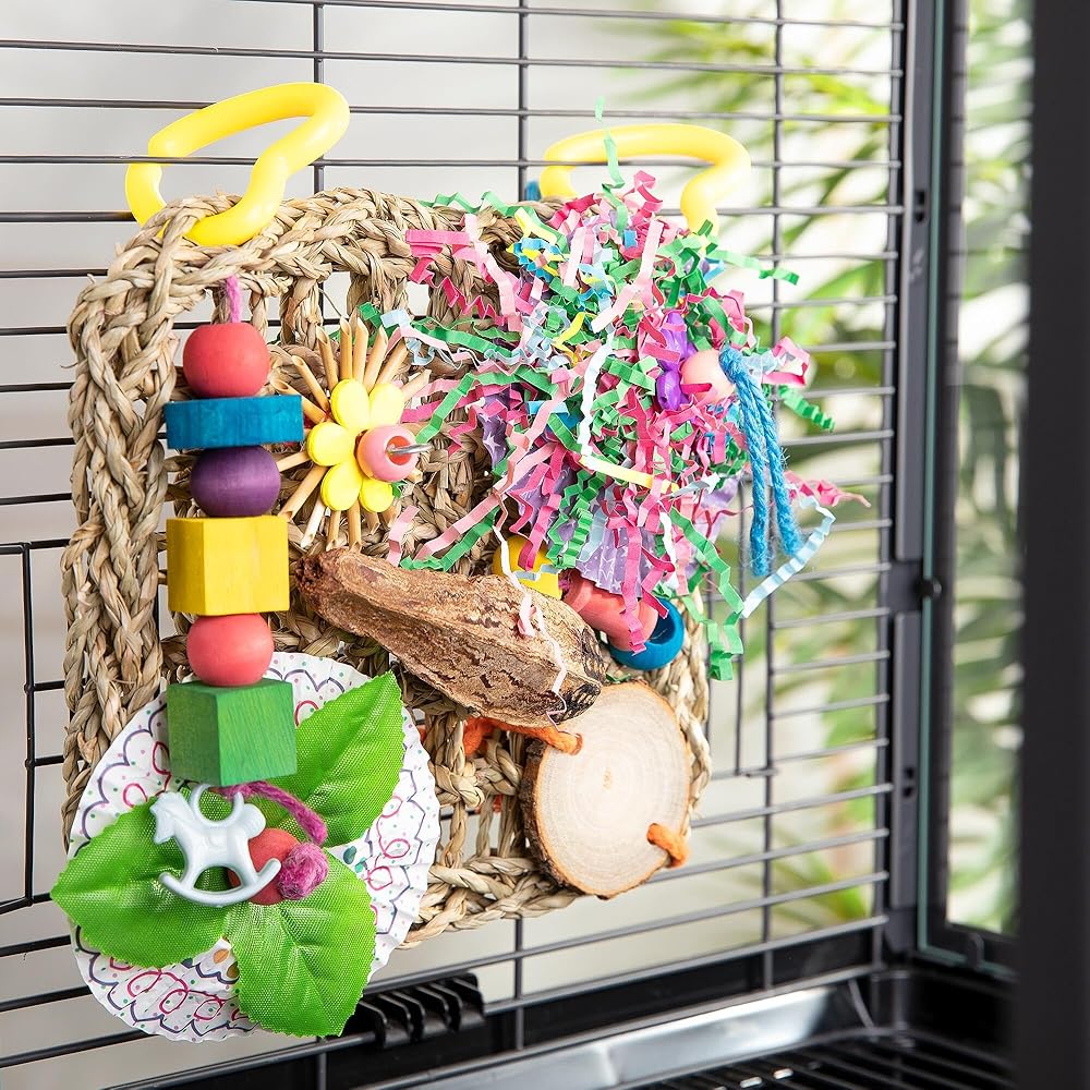 The 2-piece set of parrot toys are made of lattice shaped natural seagrass, decorated with a variety of chew items, food-grade pigment dyed and safe for birds to chew and peck. Exclusively designed to meet the daily needs of small and medium-sized birds, the brightly colored variety of items decorated easily sucks the attention of parrot birds and encourages them to climb, shred, and forage for food.