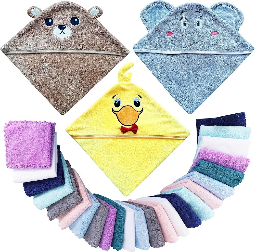 【Baby Items Package Includes】 3 pcs baby bath towel (28'' x 28'') and 24 pcs baby wash cloths (8'' x 8''), can be used to distinguish the various uses: washcloths, wipes, burp cloth, bath towels, baby showers / registry gifts, face cloths, makeup remover cloths.