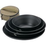 Bead blasting with black treatment plate set includes 4pcs of stainless steel camping tableware and 1pc of storage bag with handle. Four sizes of bowls and plates, each with 1pc.