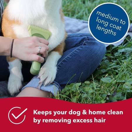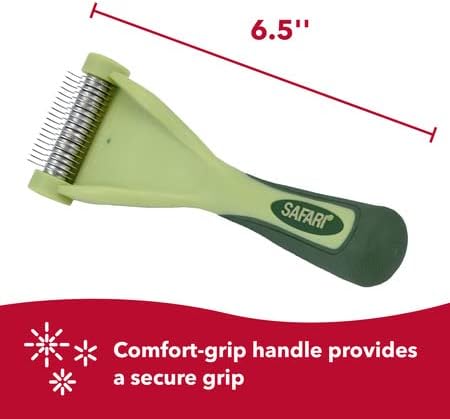 Stop excessive shedding with the safari shed Magic de-shedding tool for dogs with Medium to long hair! This brush is great for removing loose dog hair, stubborn mats, and tangles without irritating your dog's skin. The gentle stainless steel blades glide through the hair without pulling, making grooming more comfortable for your dog. Plus, its textured handle provides added comfort and maximum control. Designed specifically for Medium to long coated breeds like Shepherds, Akitas, and Collies, this brush makes it easy to maintain a healthy and beautiful coat.