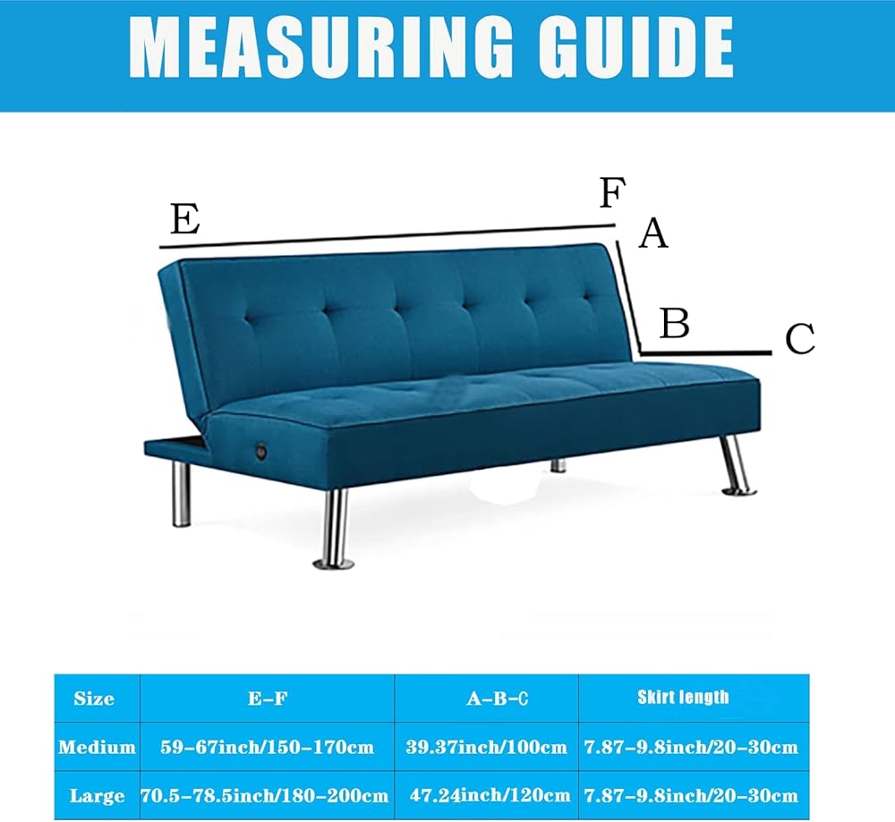 DIAMENSIONS: This armless futon cover has 2 sizes. The Medium futon cover is suitable for sofas with a total length of 59-67 inches/150-170cm and a total width of 39.37 inch/100cm. The large futon cover is suitable for sofas with a total length of 70.5-78.5 inch/180-200cm and a total width of 47.24inches/120cm.The size of the futon bed cover should be larger than the size of the futon.