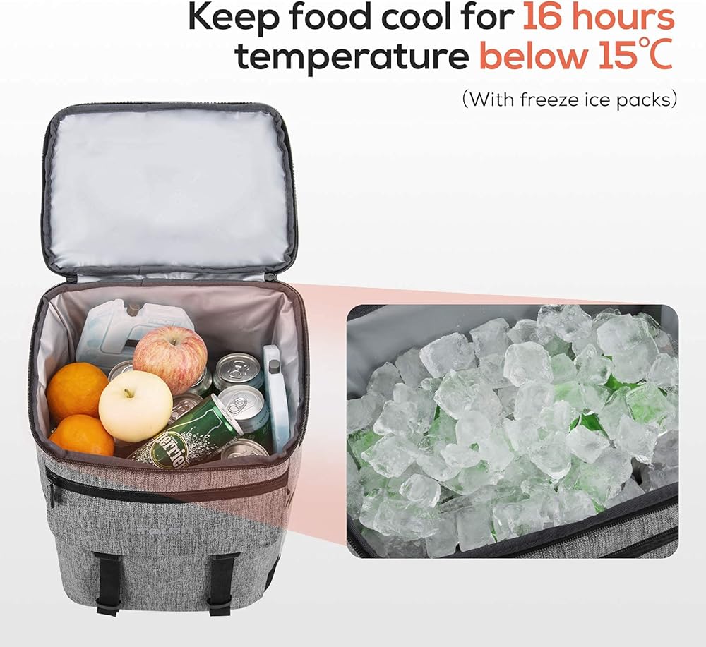 This cooler backpack choose high-density material to keep your food and drinks cool for 16 hours temperature below 15℃(with Freeze Packs).