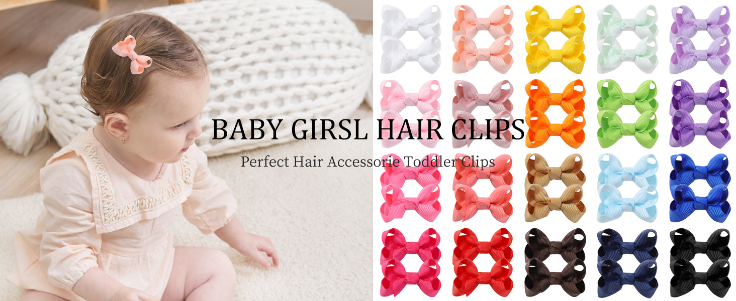 Package includes🎀 40PCS ( 20 Pairs) Baby Hair Clips. It contains 20 colors in a package, so many different colors to match your sweet girls' different outfits. Whether in daily life or special occasions, these baby girls hair bows clips can bring more fashion fun to little girls.