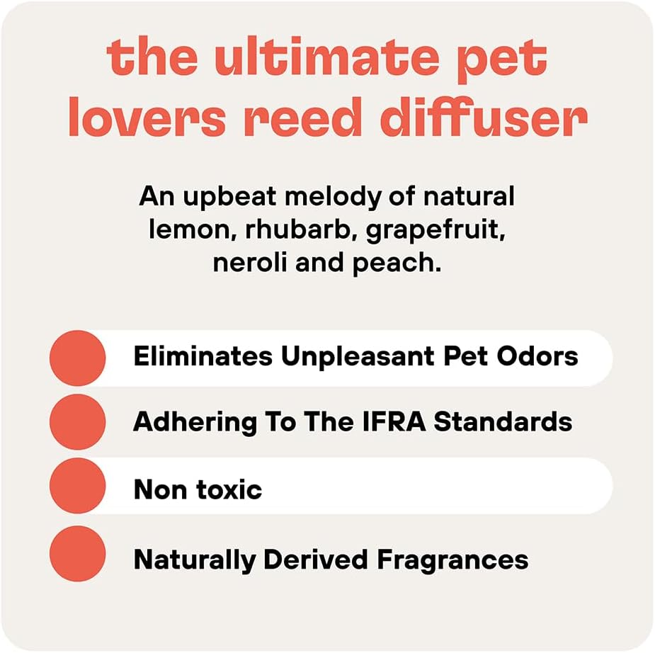 The pet-safe reed diffuser with powerful and fast acting pet odor elimination. Featuring natural scents of lemon, peach and grapefruit blended with neroli, the reed diffuser destroys bad odors completely with our proprietary odor elimination formula. The reed diffuser keeps spaces as large as 645 square feet odor-free, fresh and smelling awesome.