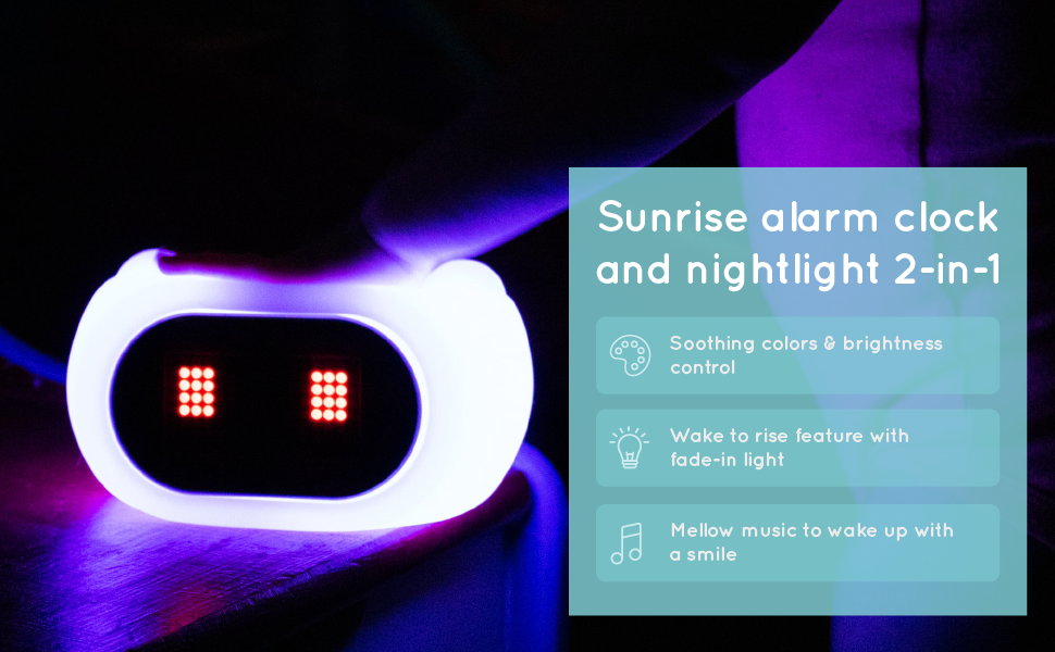 This fully customizable light up kids' alarm clock makes falling asleep and waking up fun! The color can be adjusted by tapping the clock. When this function are turned off, controls on the back can be used to override it. Brightness is controlled with the rear controls. The wake to rise feature is tied to the alarm, so you don't have to worry about matching two different settings.