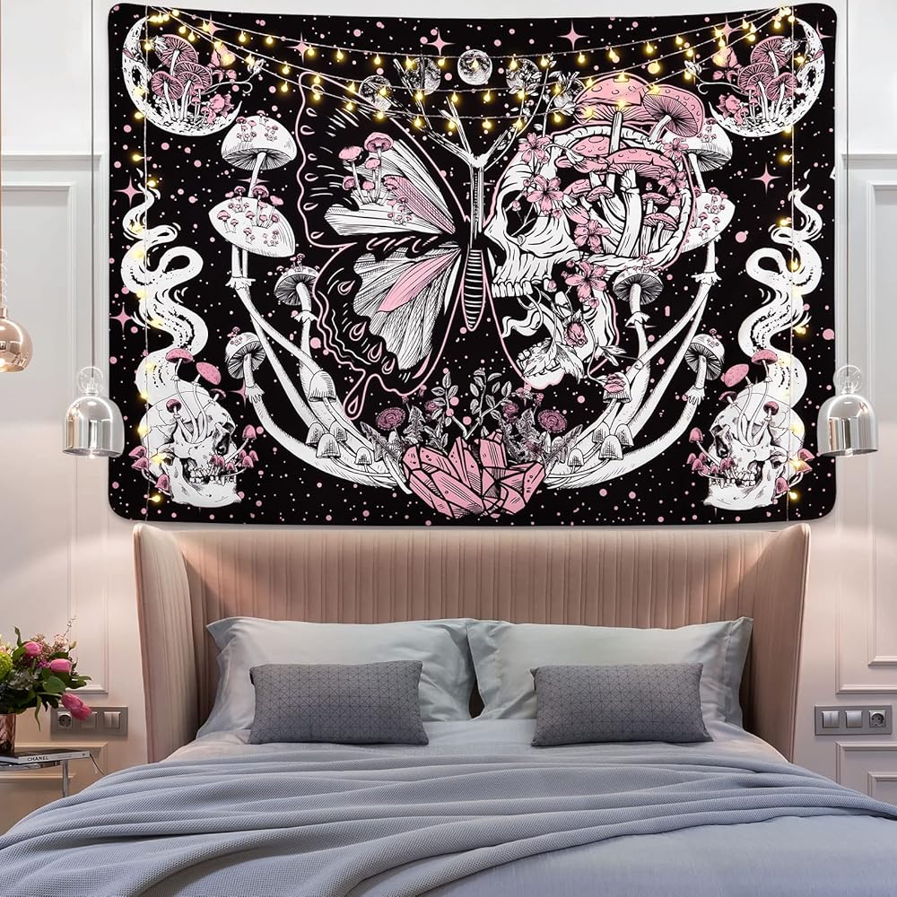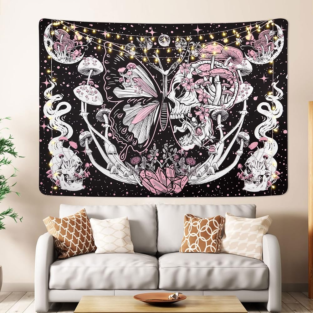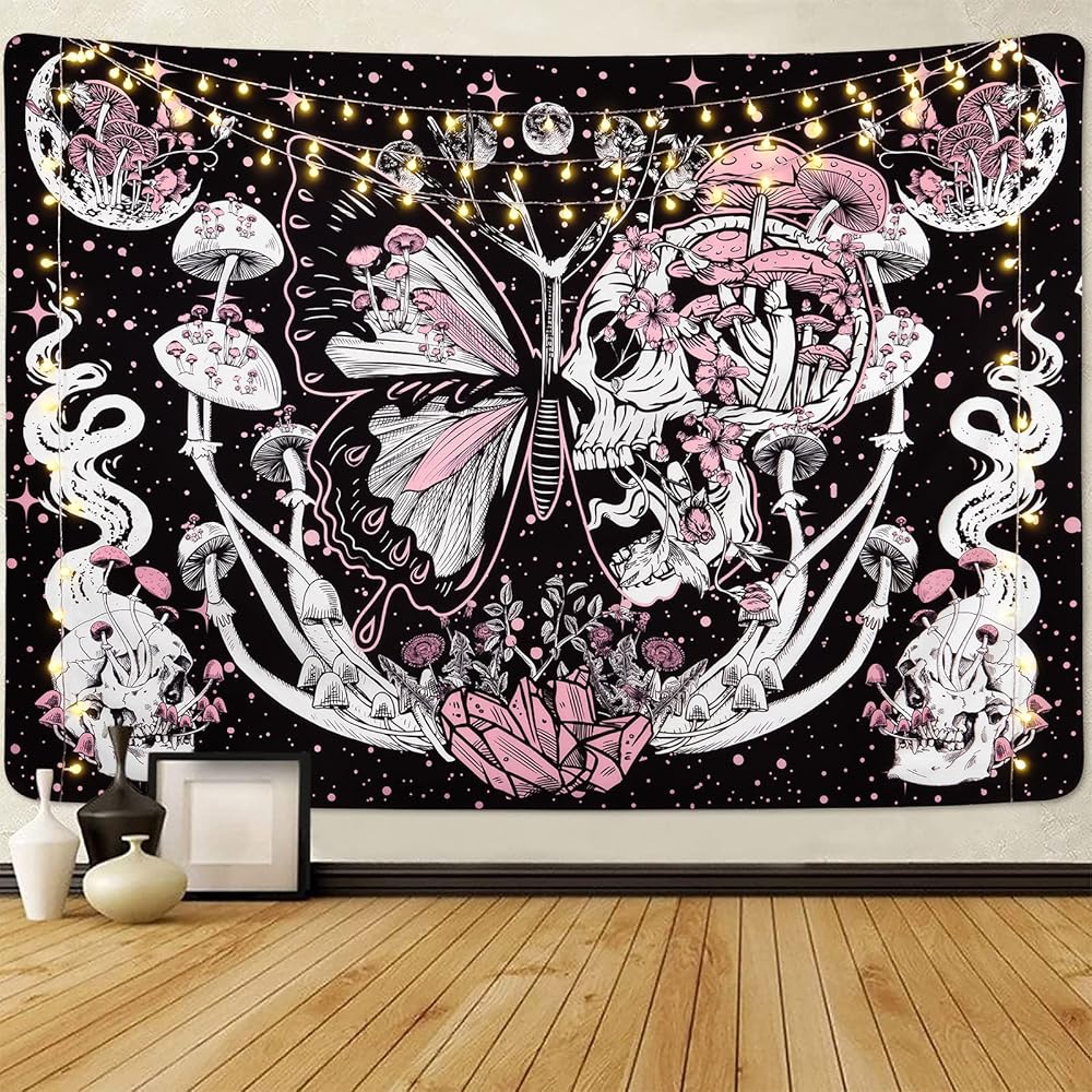 Lyacmy Blacklight Skull UV Reactive Mushroom Butterfly and Hippie Snake Wall Tapestries for Bedroom (51.2 x 59.1 inches)