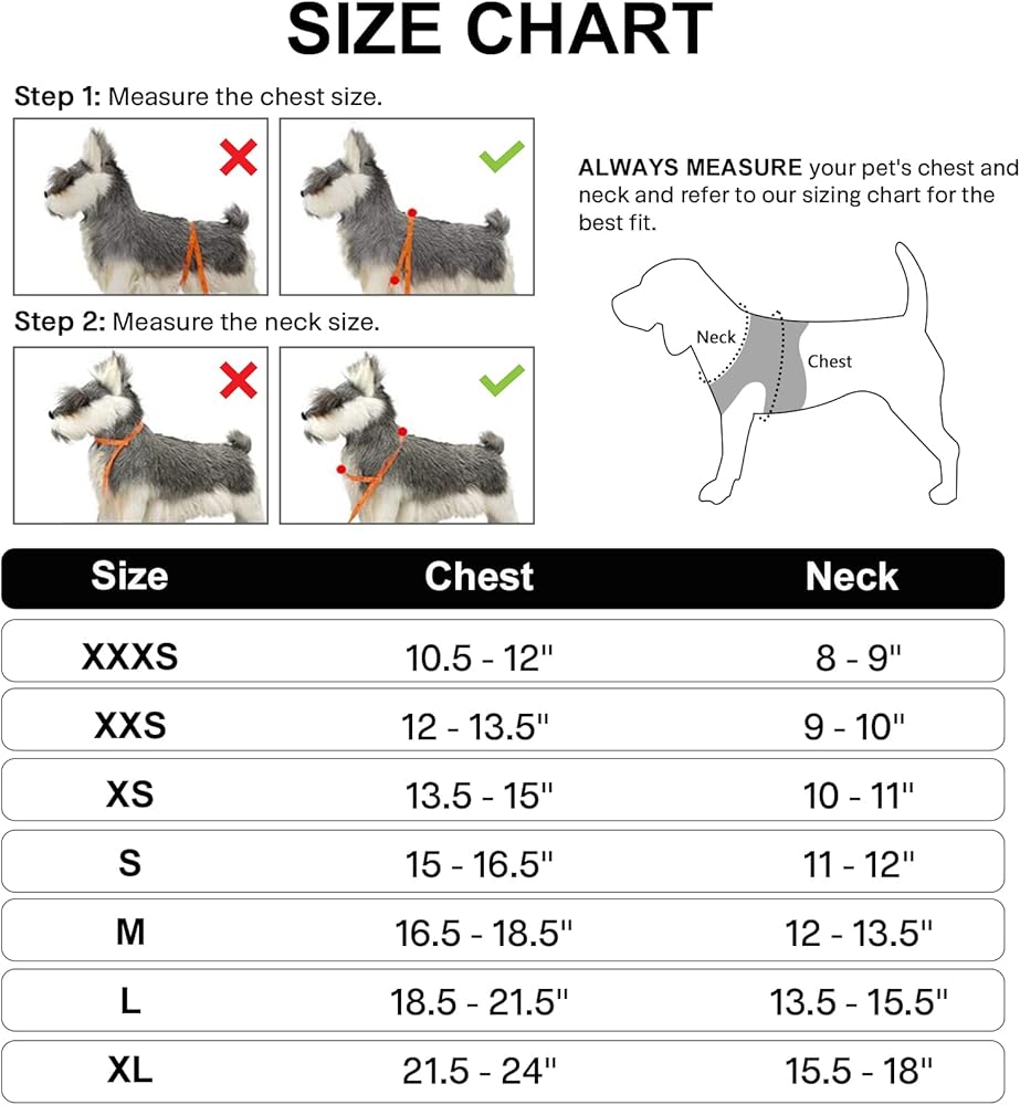 [Size Guide] It is highly recommended to measure the widest part of your pet's chest and neck and refer the size chart before placing an order. It is not suggested to choose the size by weight only. It is ideal for extra-small, small and medium male female breeds.