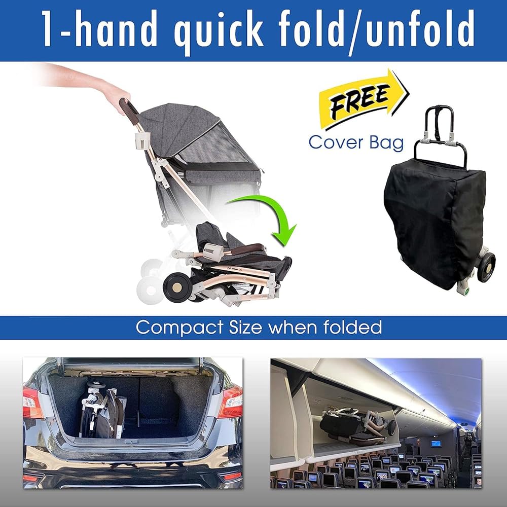 THE PERFECT LIGHT-WEIGHT TRAVEL PET STROLLER + FREE TRAVEL BAG from PetRoverUSA New HPZ Pet Rover Lite Pet Stroller Features:?? SUPER COMPACT FOLDED SIZEWhen folded, it's smaller than an ?airline-approved small luggage, perfect for moving in and out of cars, busses, trains or planes.?? CONVERTIBLE SIZE COMPARTMENTBoth front & rear can be expanded from 13inch to 27inch long (13inch wide) to fit a medium pet or multiple smaller pets up to 45 Lbs. total.?? 1-HAND FOLDING/UNFOLDING – Innovative mechanism allows quick fold and unfold with just one hand in seconds.?? ZIPPER-LESS CANOPY CLOSUREInnovative no-zip features easy-locking latches, for immediate access to your pet without having to fumble with zippers.?? RIGID ALUMINUM FRAME – The stroller frame is made of rust-free aluminum in an anodized gold color for light-weight, elegant, functional and durable construction.?? INTEGRATED MEAL BOWL HOLDER – Innovative retractable bowl holder keeps pets fed anywhere any time.?? TRAVEL-FRIENDLY CONVENIENT FEATURES – Retractable towing handle allows the folded stroller to transport with ease. Auto-lock feature prevents the stroller from expanding unexpectedly when folded.?? DURABLE WHEELSDurable wheels with front shock suspension reduces vibration and maximizes stability on all terrain.?? PREMIUM PU-LEATHER HANDLEBAR COVERLuxury and durable PU-leather cover provides comfortable handling of the stroller.?? PLENTY OF STORAGE – 3 organizer pockets and large under-basket provide plenty of storage space.?? PET-FRIENDLY CONVENIENT FEATURES – Rear window and 3-stop canopy opening levels provide viewing flexibility.?? NO ASSEMBLY REQUIRED – 1-minute Plug&Play assembly requires only the snap on of the front and rear wheels.Weight=15.6Lbs/Max Capacity=45 Lbs Stroller Size=28Lx40Hx14front&20rear-Winch (14Lx20Wx22Hinch folded) Pet Compartment Floor=13Lx13Winch to 27L