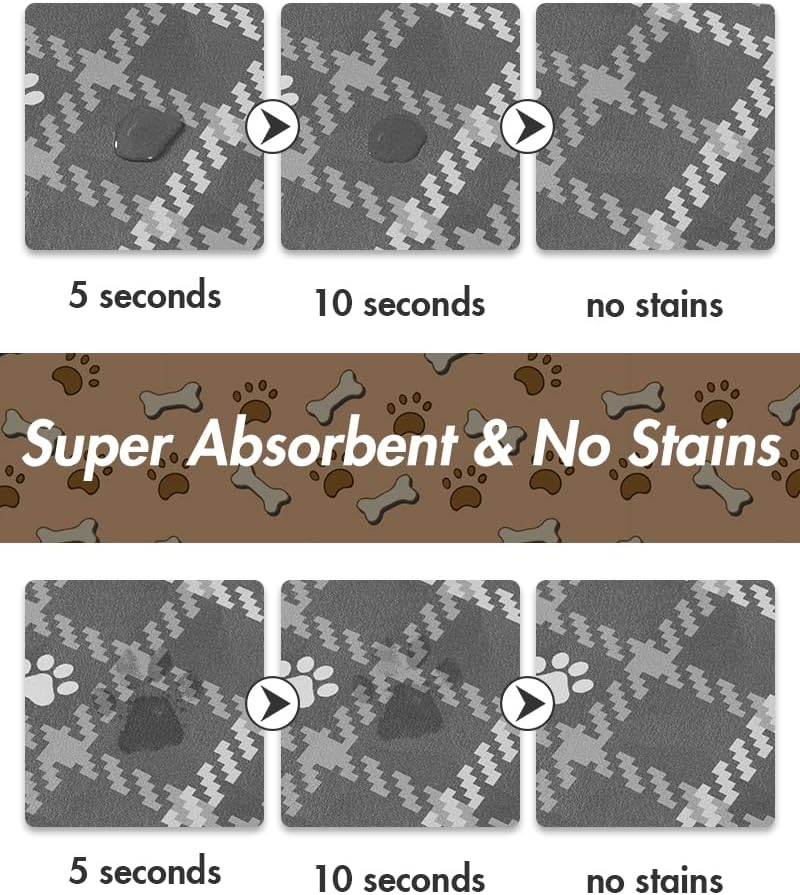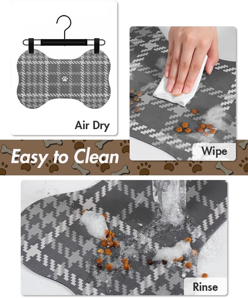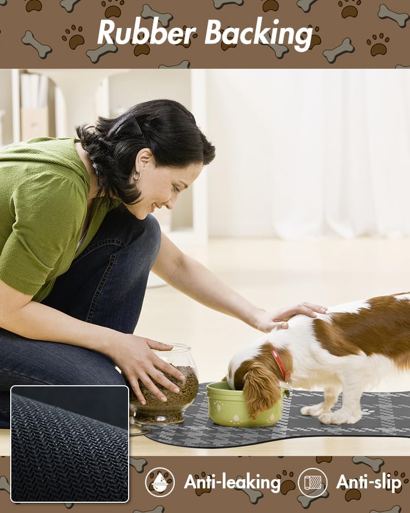Super Absorbent & No Stains:This dog mat for food and water can absorb spills and drips from your pet's food and water bowls. No marks will be left when food and water are dropped on the pet food mat. Say goodbye to the messy dog food mats for floors. Super absorbent and quick-dry ability of this dog bowl mat can avoid wetting pet paws even for messy drinkers. Perfect dog accessories providing your pets with a comfortable and clean feeding area.