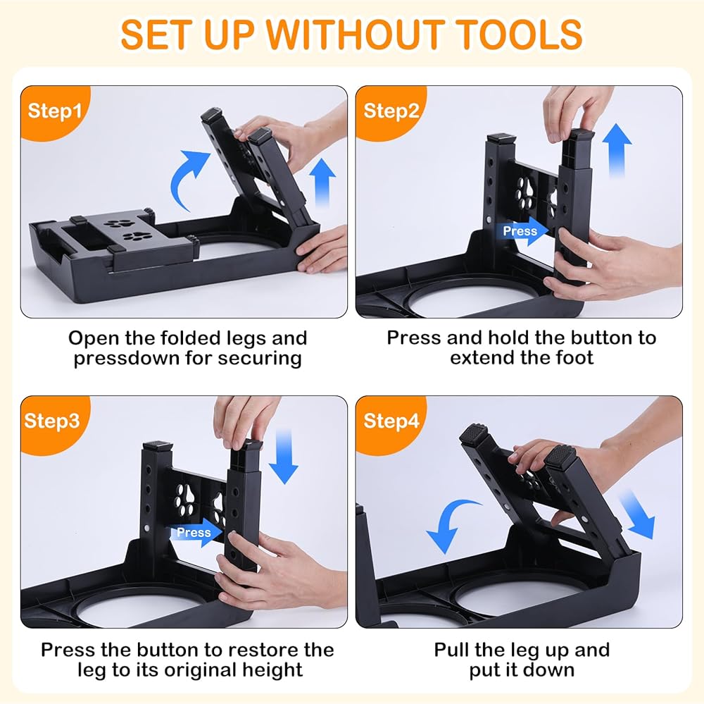 High Quality and Durable: The dog feeding & watering supplies adopts high-quality ABS materials, safe and comfort for pets. Adjustable raised dog bowl stand reaches the ideal height meets small medium large dogs in order to reduce strain on their neck and back.