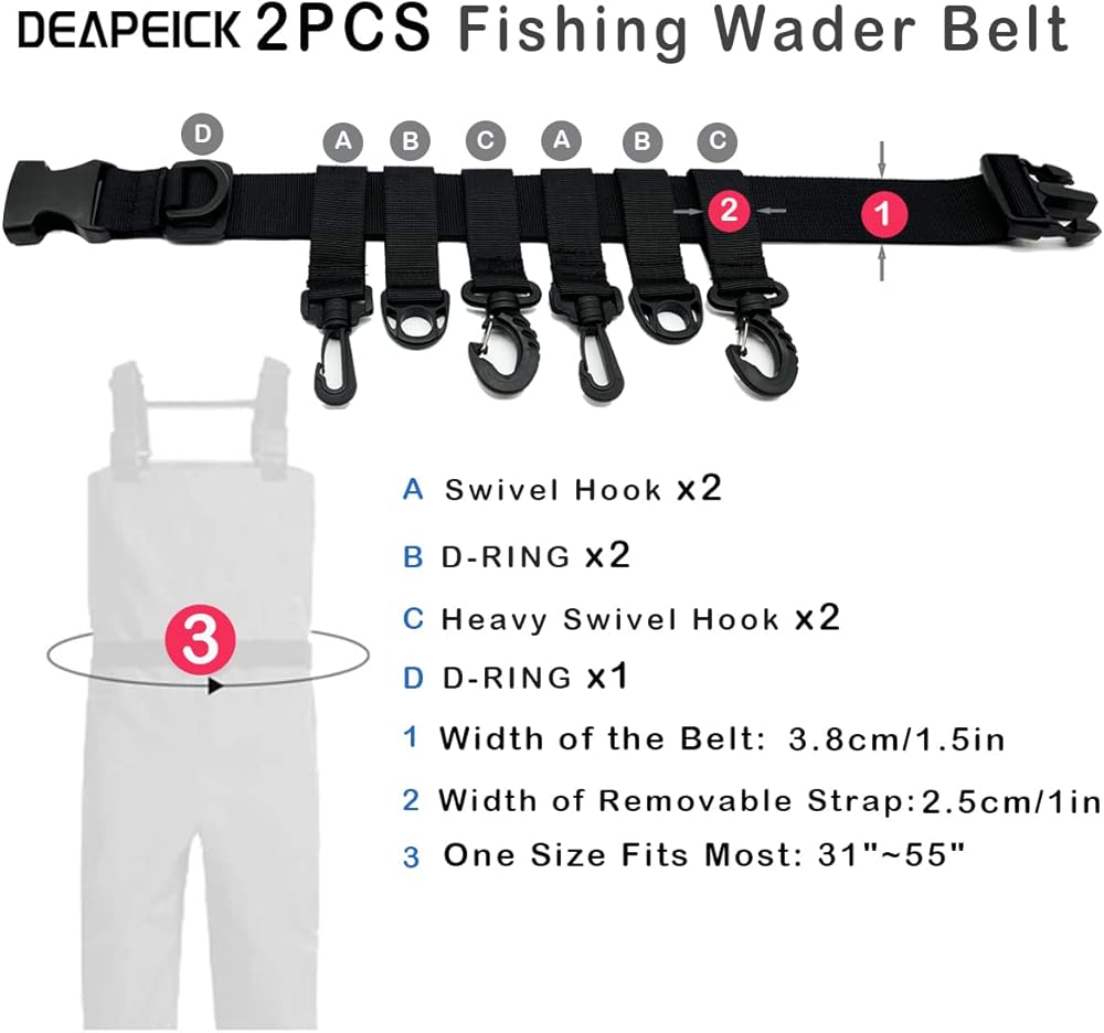 One Size Fits Most: DEAPEICK Adjustable fishing wader belt which fits fully adjustable from 31" to 58" waist, comfortable fit all chest waders for men. Come with 2pcs, you can get a good quality item with less payment.