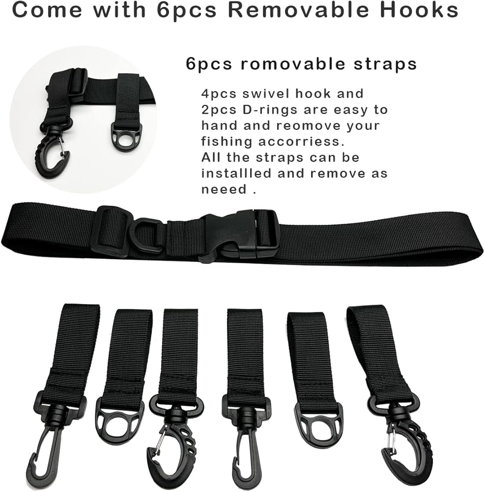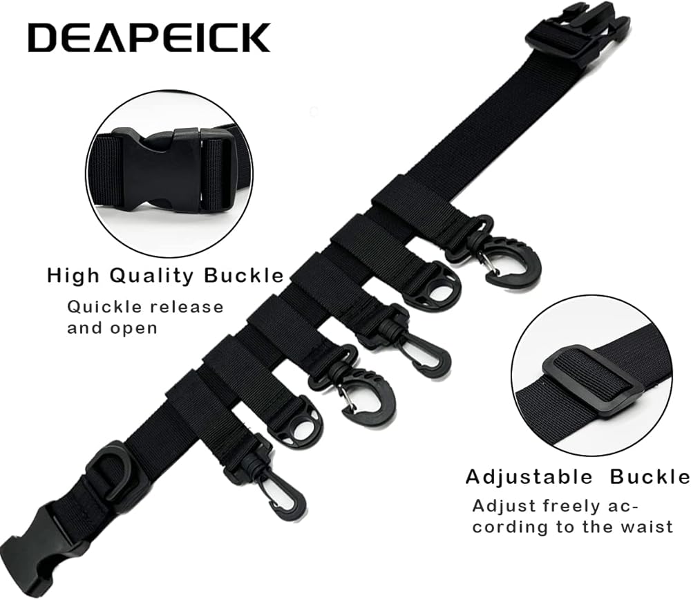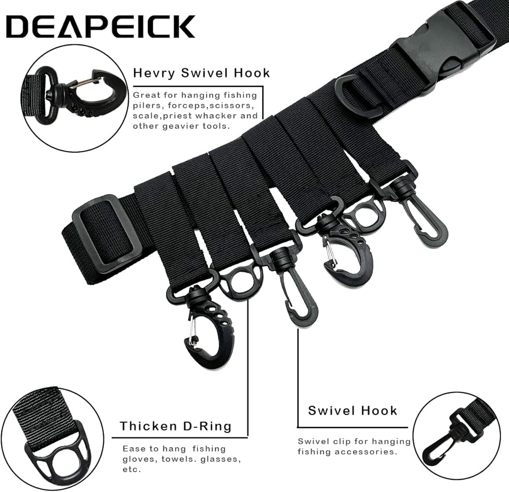 More Hook and D-Rings:DEAPEICK multi-functional fisihing wading belt has 4 swivel hooks and 3 D-rings per piece which help you take more fishing tackles you need when you go fishing.Such as such as pliers, scissor, water bottle, gloves, tackle box, etc. All the hooks and Rings made of strong ABS materials. And all of them you can move it right or left easily.