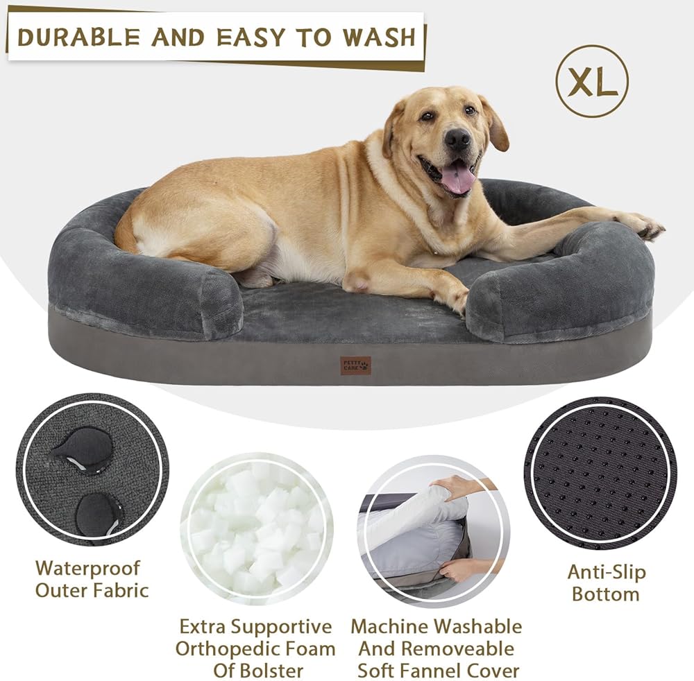 pettycare Orthopedic Dog Bed for Medium Dogs with Memory Foam, Waterproof Pet Bed Soft Sofa with Washable Removable Cover Anti-Slip Bottom, Extra Head and Neck Support Sleeper, 30" Dark Grey