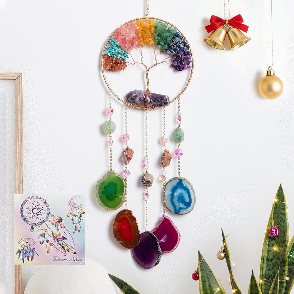 Tree of Life Dream Catcher- Dreamsum Dream Catchers for Adults with Rainbow Crystal Handmade Gold Agate Dreamcatcher Window Decor for Adults Girls, Bedroom, Christmas, Garden, Bless Gift