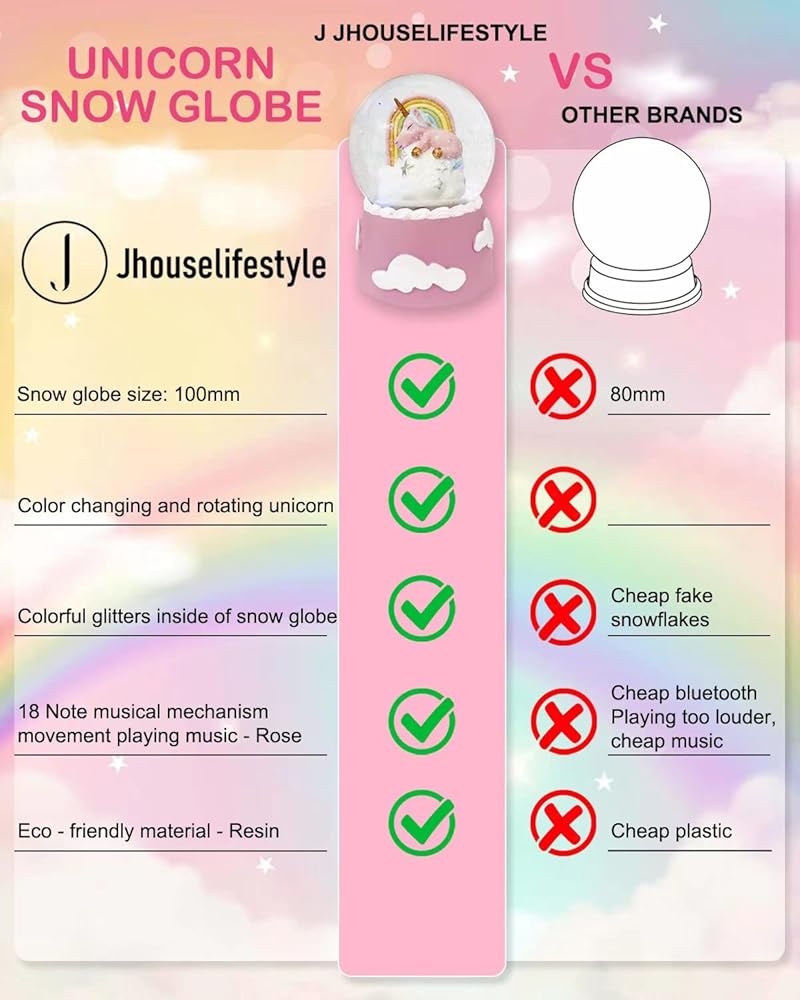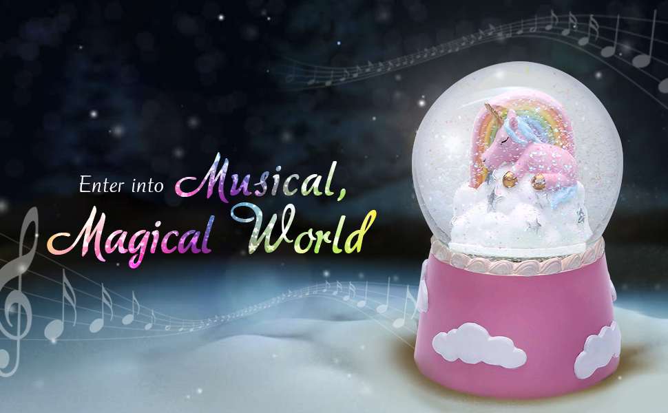 Cute Snow Globes for Kids. The cute unicorn sleeping on the white clouds & silver sparkling stars, a beautiful rainbow arced gracefully over her. What a lovely and harmonious scene! Wind up it and turn on the switch on the bottom, the unicorn in the colorful dreamy lights rotates gently with the music tune- Rose