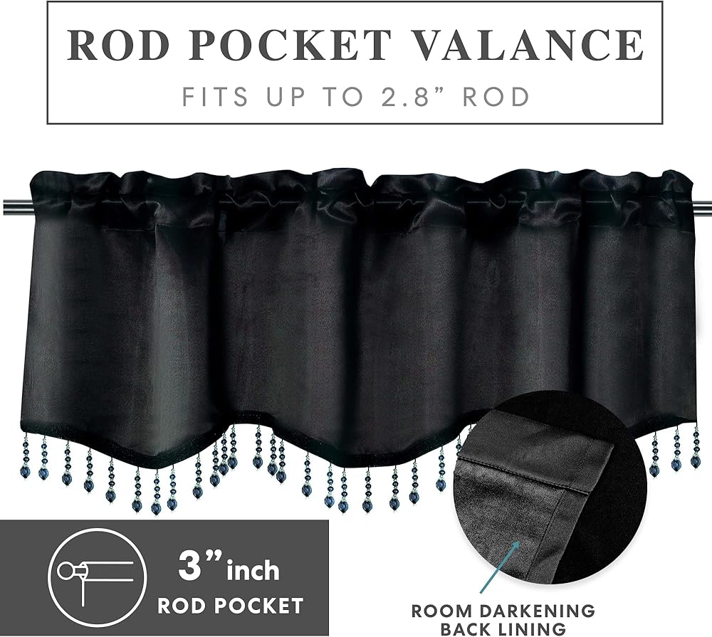 Solid valance flaunts a scalloped edge and drop crystal beading for a decorated look.