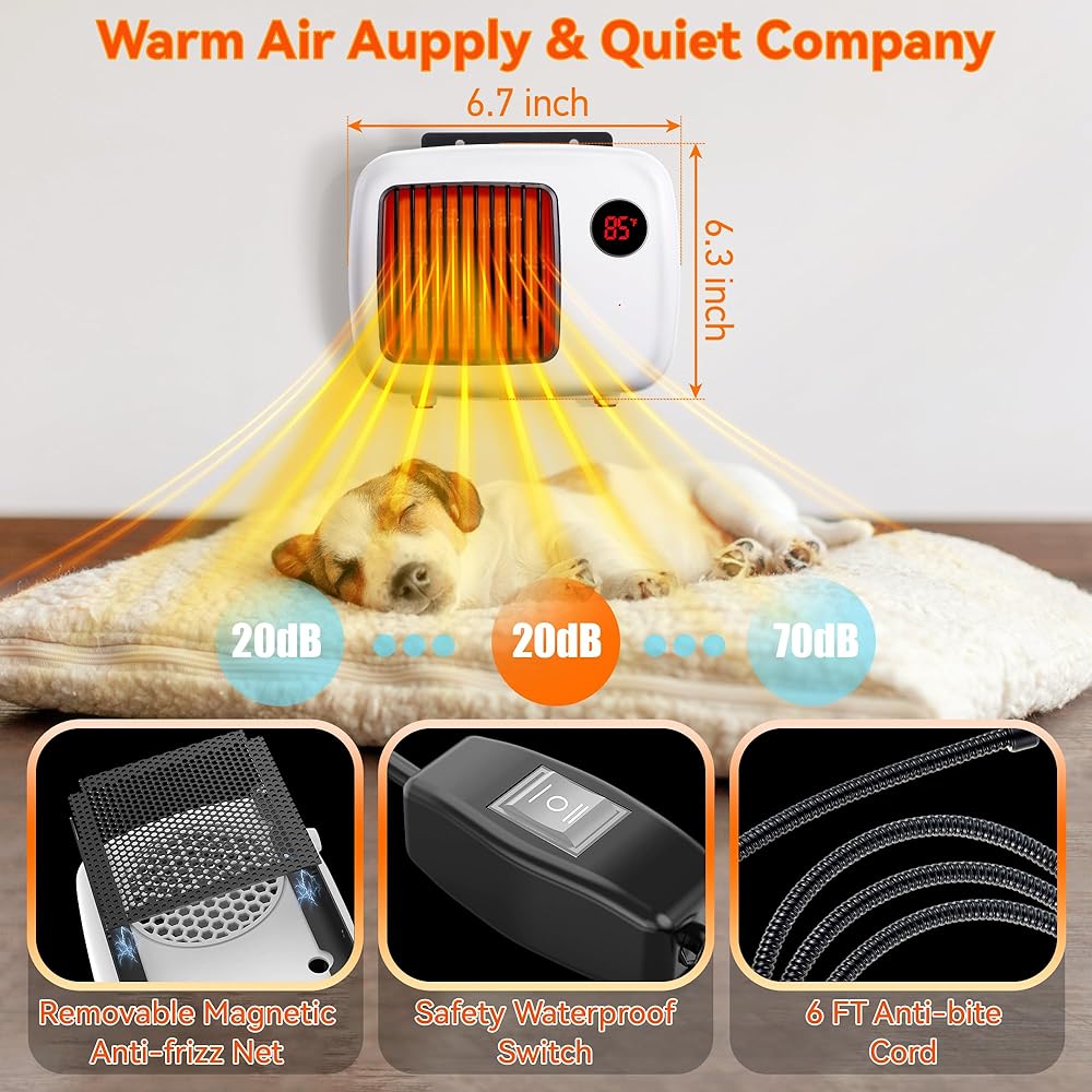 • 🔥【Easy to Install and Clean】🔥: independent safety bracket makes the heater easy to install in the dog house; Only 3 steps: 1. Find a position taller than your pet; 2. Drill hole; 3. Hang the heater; Then you can let your pet enjoy a warm winter; Meanwhile, the magnetic removable hair guard on the back of the heater makes it easy to clean your pet's hair and dust without removing the heater, convenient for daily use