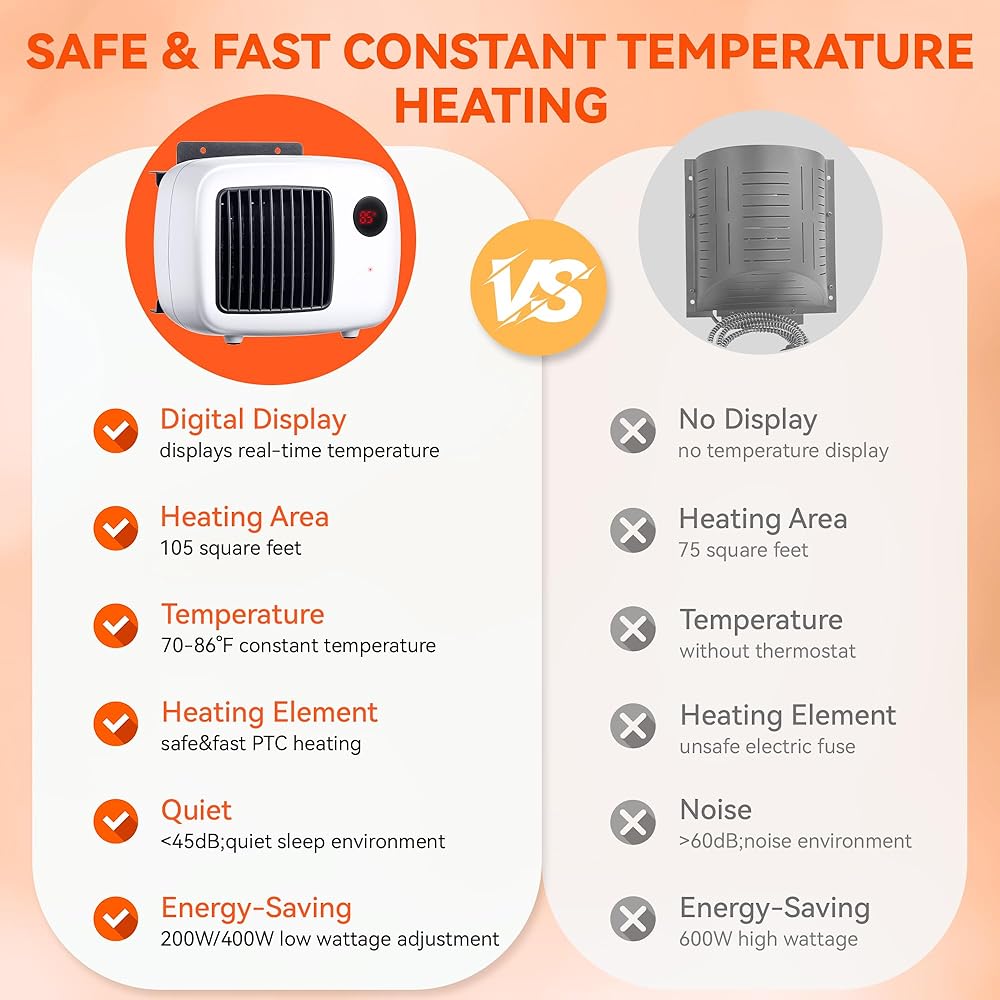 • 🔥【Wall Space Pet House Heater】🔥: the wall space pet house heater adopts 110V input AC voltage with 200W/400W low wattage design, which lets the heater not overload the circuit and it is a more energy saving heater than other running higher wattage electric heater; With a compact structure and lightweight body, only 6.7 x 6.3 x 4.7 inch in size, but the heating covers up to 105 square feet, this depends on whether your room is airtight