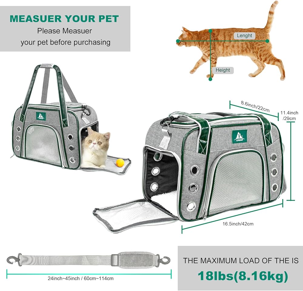Spacious and Secure: Our cat carrier measures 17x11.4x8.7 inches, providing plenty of room for your feline friend. It can safely accommodate cats weighing up to 18 pounds, ensuring a secure and comfortable travel experience.