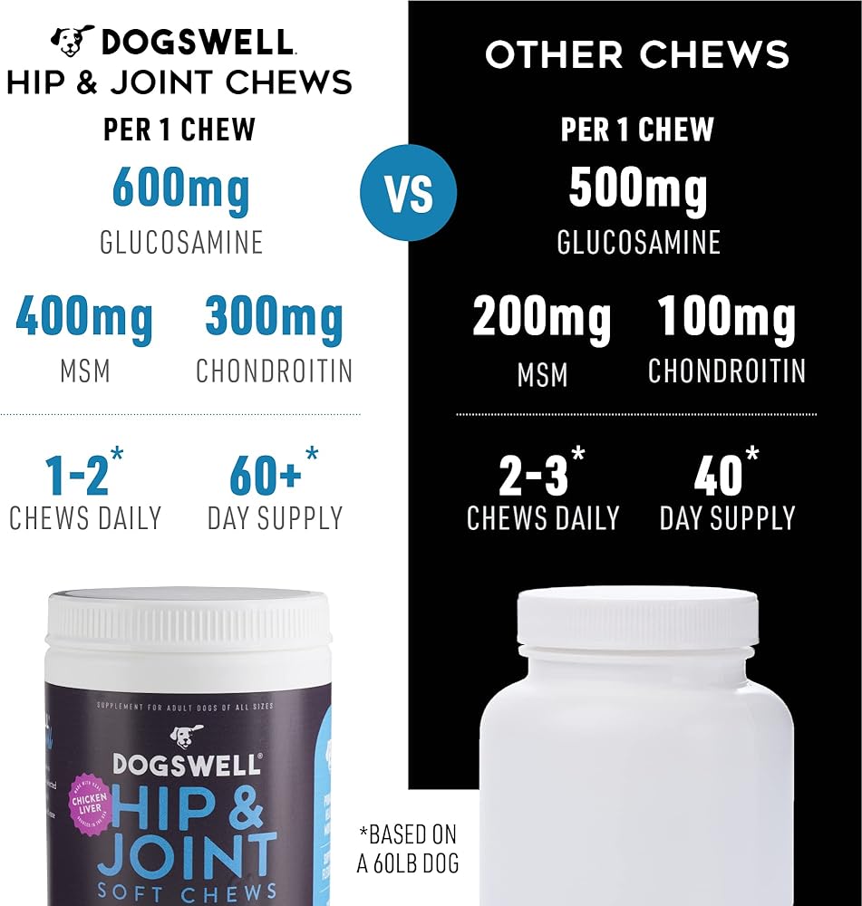 Made with Clean, Recognizable Ingredients – Unlike other supplements, Dogswell Hip & Joint Soft Chews are made with natural ingredients like chicken liver, fenugreek, flaxseed, and oat flour