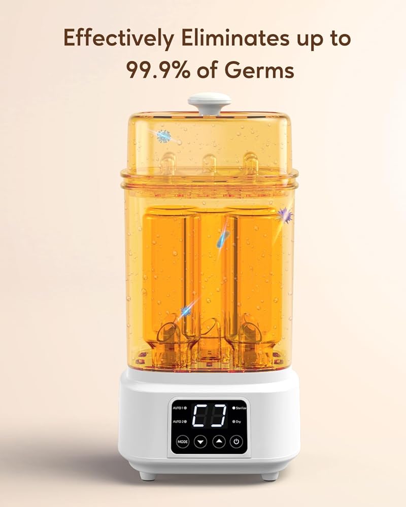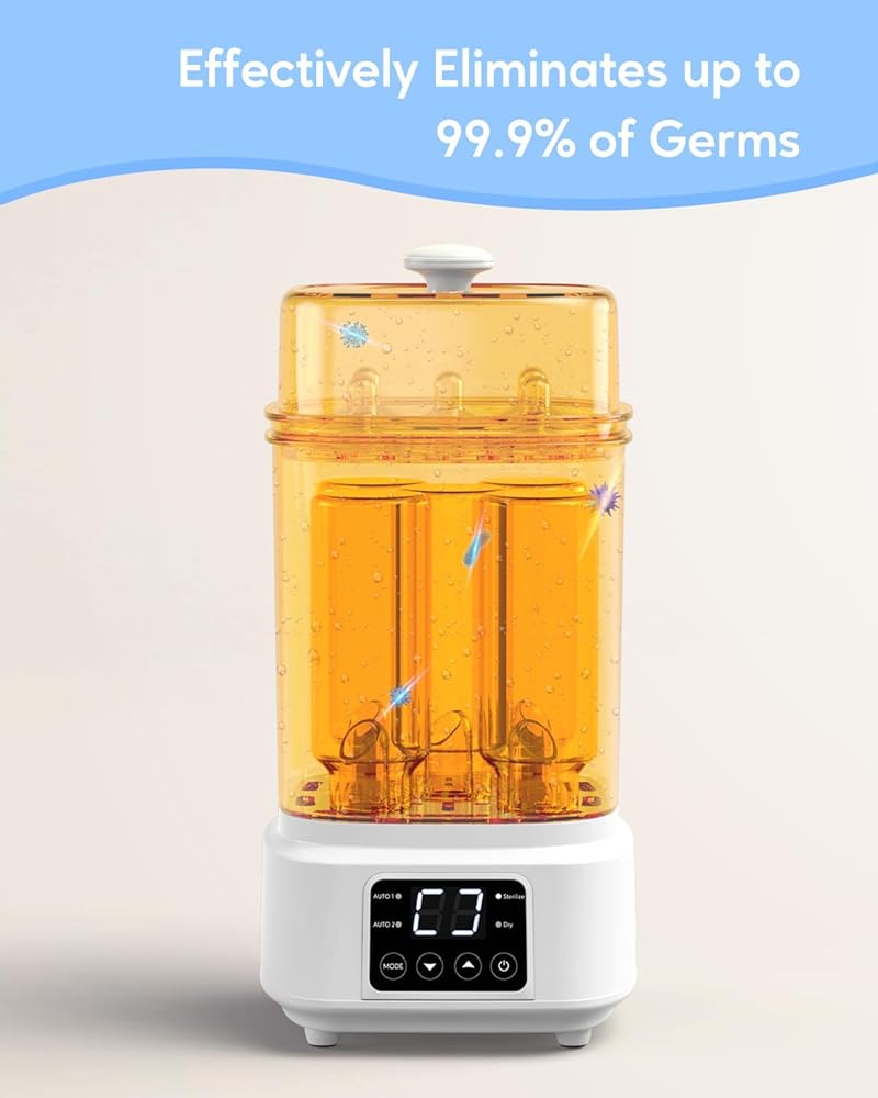 【تعقيم فعال】يستخدم معقم الزجاجات بخارًا بدرجة حرارة عالية للقضاء بشكل فعال على 99.9% من البكتيريا والفيروسات في غضون 10 دقائق فقط، مما يوفر أدوات تغذية صحية لطفلك. ترشيح الجسيمات والملوثات المحمولة بالهواء لمنع التلوث الثانوي باستخدام فلتر مدمج.