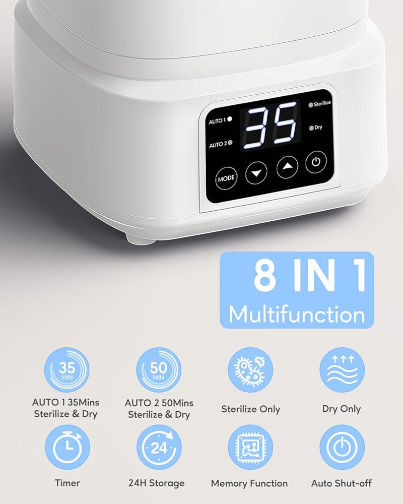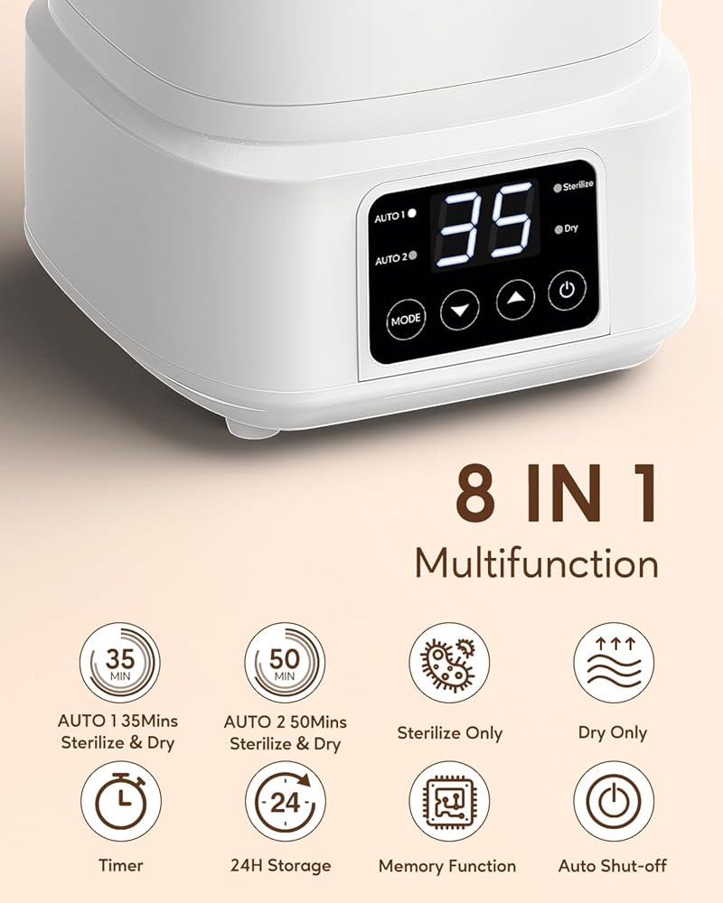 متعدد الوظائف: تلقائي 1 (تعقيم وتجفيف لمدة 35 دقيقة) / تلقائي 2 (تعقيم وتجفيف لمدة 50 دقيقة) / تعقيم فقط / تجفيف فقط. تجفف الخيارات التلقائية تلقائيًا بعد التعقيم بالبخار، مما يوفر لك الوقت والجهد. بالإضافة إلى ذلك، مؤقت مدمج، إيقاف تلقائي، وظيفة الذاكرة، وحجرة قابلة للإزالة وصينية لتخزين الزجاجات والملحقات.
