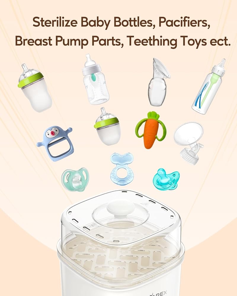 【توافق عالمي】يتوافق معقم زجاجات الأطفال مع جميع أحجام الزجاجات/العلامات التجارية وملحقات الزجاجات مثل أجزاء مضخة الثدي واللهايات وحلقات التسنين والألعاب الصغيرة، مما يزيل مخاوف التوافق.