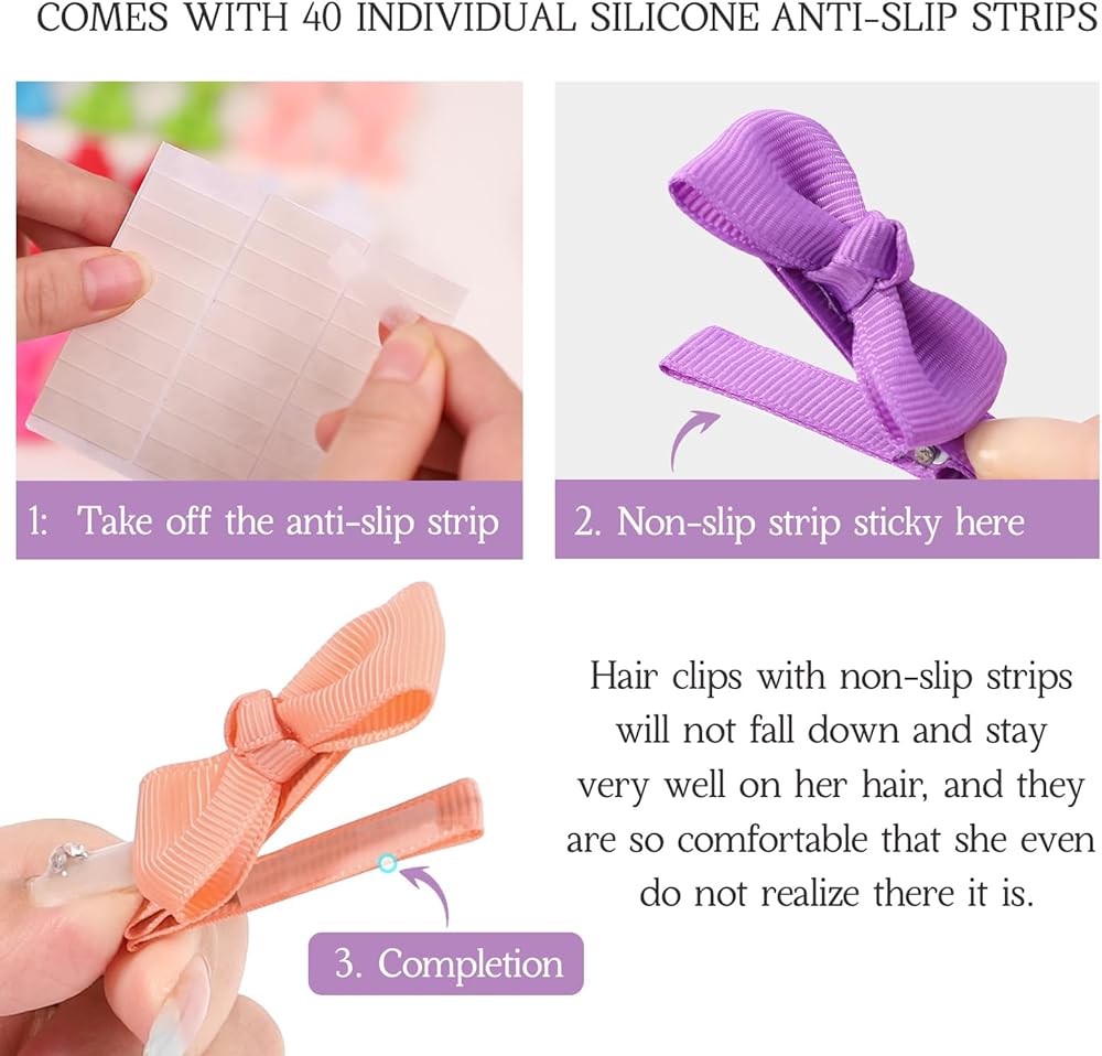【PACKAGE INCLUDE】40 pieces about 2inch baby hair clips and 40 individual silicone non-slip strips, each color has two hair bows, a total of 20 popular colors. So many different colors to match different outfits. A great gift for someone having a little girl.