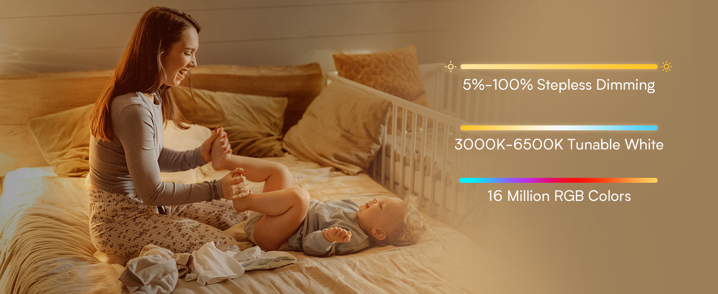 【RGB Night Light Lamp】Pick from 5%-100% stepless dimmable brightness, 3000K to 6500K tunable white and 16 million RGB colors, to DIY the most appropriate lighting for your needs. Versatile security night light for kids, nursery night light for breastfeeding moms, nightstand lamp for elders, ambient lighting for story-telling, parties, holiday, room décor etc.