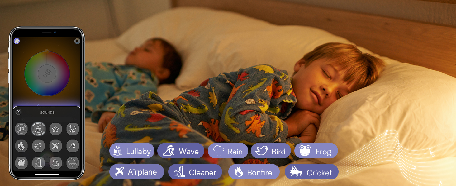 【3-in-1Smart Night Light】Hotmoon Lullight = Sound Machine + Night Light + Sleep Trainer, all in one that is designed not only for baby nursery, but also for everyone who loves to sleep with soothing lights, sounds or both. Personalize your routine with customizable brightness, color, sound, volume, timer etc to enjoy a better solid sleep.