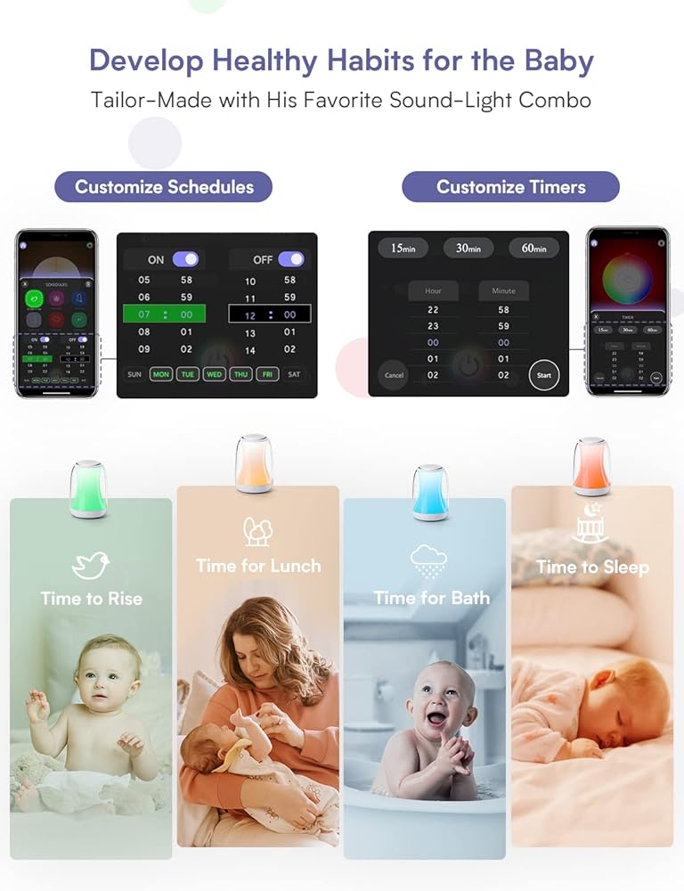【Smart Sleep Trainer】Set up sound-light combos as sleep-wake hints via the smart timer setting. Teach toddler, preschooler, big kids when is time for bed and when it is time to rise. Create a personalized schedule for him to develop healthy sleep habits and improve sleeping quality.