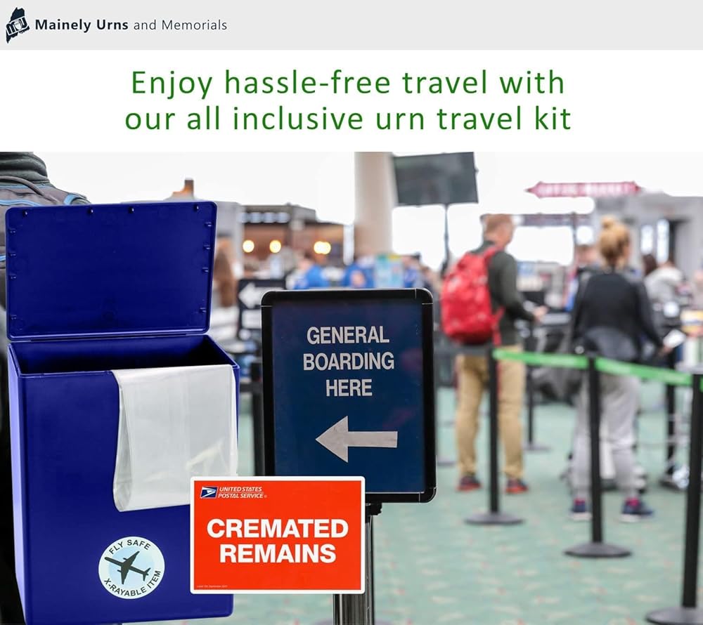 TSA APPROVED: Our TSA Approved, all inclusive temporary cremation urn kit includes a black temporary travel urn, white cardboard travel/shipping box, plastic cremains bag, zip tie, and USPS Cremated Remains stickers. This cremation urn is made of x-rayable materials that will pass through airport x-ray machines and is permissible as a carry-on or can be checked with baggage (airline policies may differ so please check with your airline regarding traveling with ashes).