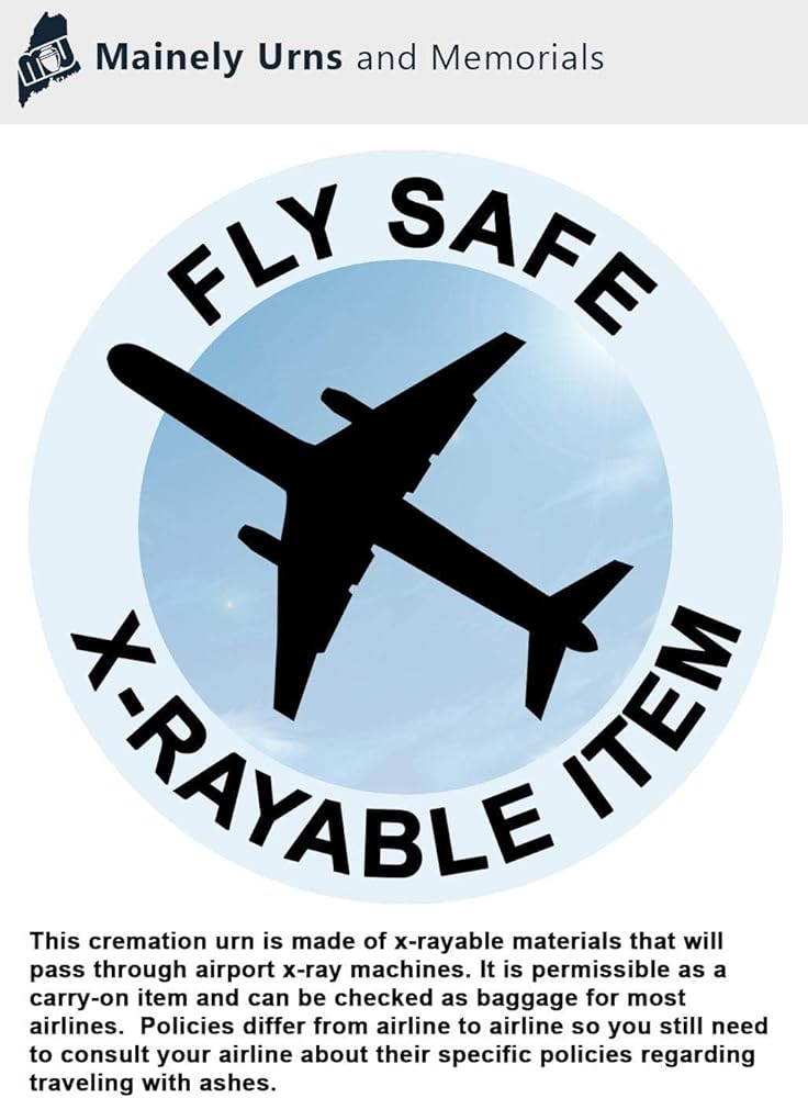 This cremation urn is made of x-rayable materials that will pass through airport x-ray machines. It is permissible as a carry-on item and can be checked as baggage for most airlines. Policies differ from airline to airline so you still need to consult your airline about their specific policies regarding traveling with ashes.