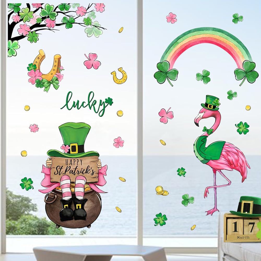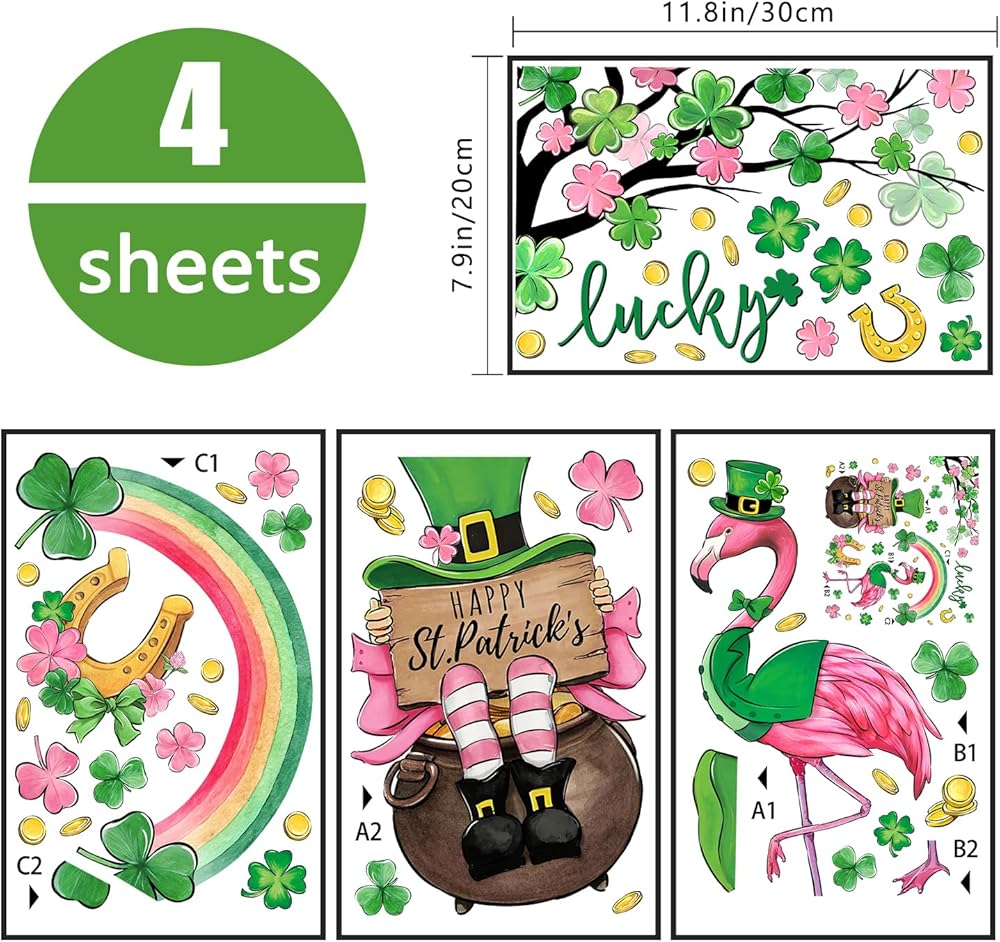 Yovkky Happy St. Patrick's Day Window Clings 4 Sheets, Flamingo Leprechaun Lucky Shamrock Clover Tree Rainbow Sticker Decal Decor, Golden Coins Irish Spring Home Kitchen Decorations