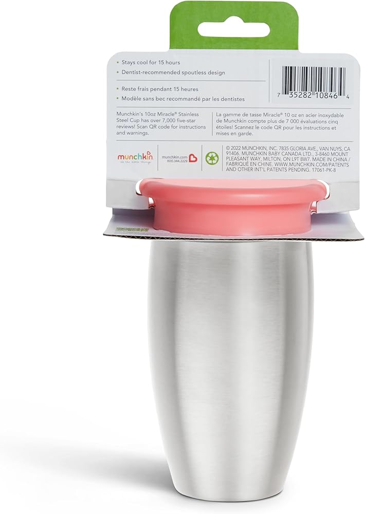 Munchkin Miracle stainless steel 360 sippy cup is here to "steel" Your heart when it comes to sippy cups. Let's face it: toddlers are a messy bunch, especially when first navigating sippy cups. Now imagine a world in which drinks didn't spill at all-no, it's not a miracle- it's Munchkin Miracle 360 Cup. This premium insulated stainless steel sippy cup keeps liquids cool for fresh and cold toddler drinks all day. Light-weight stainless steel material is extremely durable and double wall design won't sweat or get hands cold. Patented 360 rim eliminates messes and supports kids' Dental health All at once because drinking from anywhere around the rim, like a regular cup, helps support normal muscle development in a child's mouth. Also includes matching cup lid to keep drinking edge clean on-the go. With no extra spouts, straws or pieces, the Miracle 360 Cup is easy to use and even easier to clean. We'll say Cheers to that. Suitable for children 12 months and up.