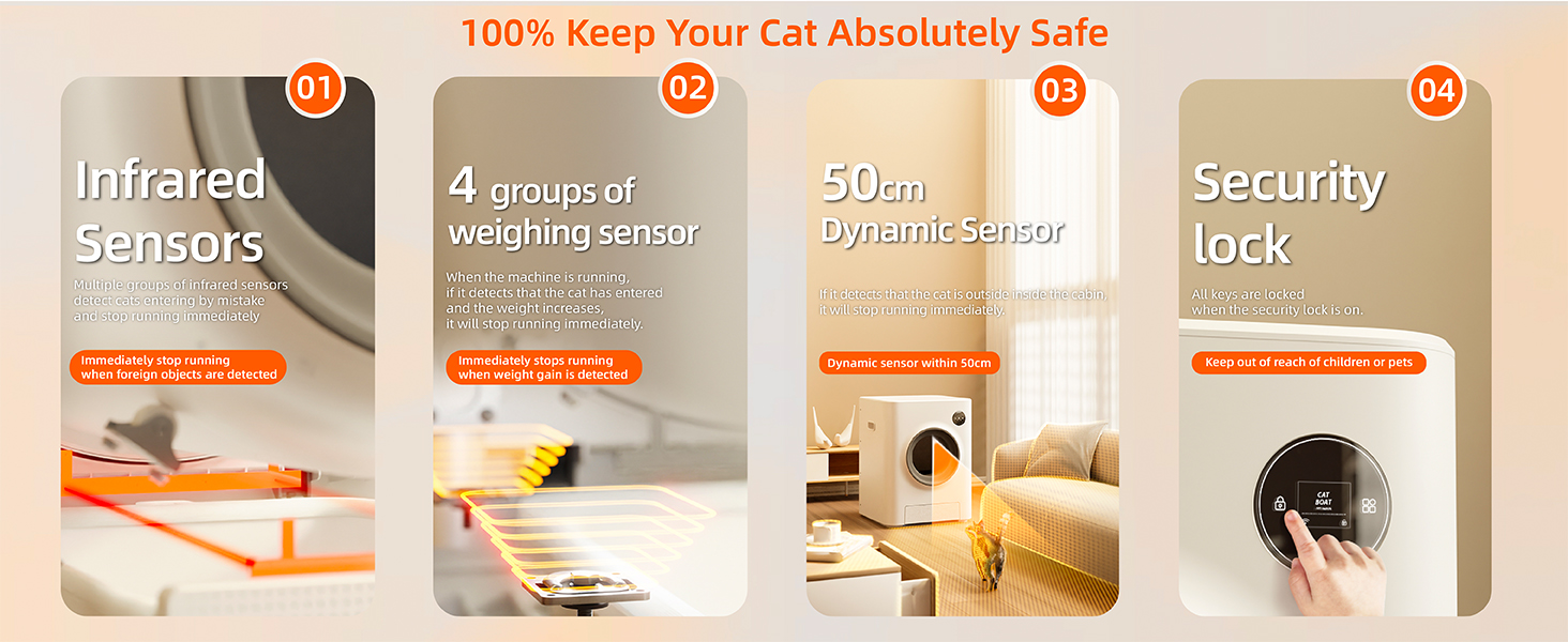 100% Safe for Cats: Our self-cleaning cat litter box adopts several safety mechanisms to protect your loving pets. The smart sensor will stop the box from working immediately when unknown objects or increased weight are detected. A 50cm infrared detector can also shut down the box as soon as it detects cat activity nearby and inside. Meanwhile, the safety lock protects both your children and pets from getting hurt.