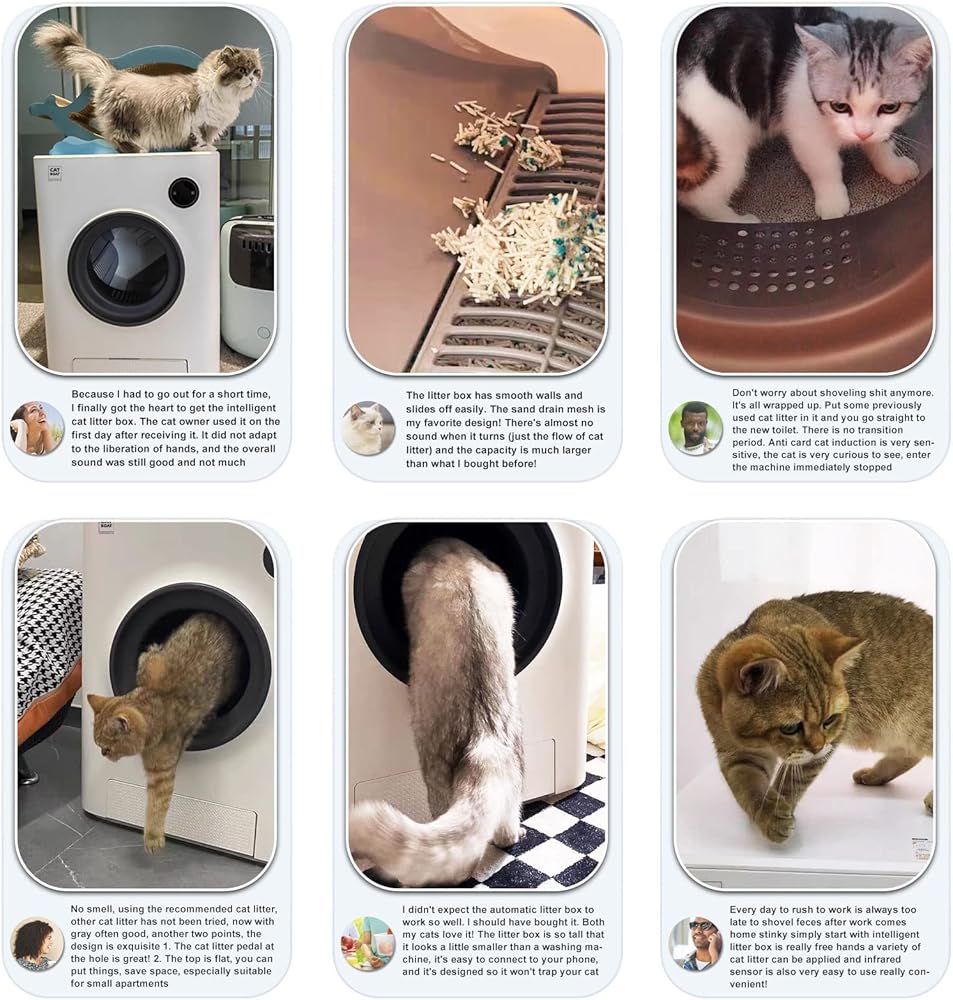 Extra-Large Capacity: The extra-large waste container allows up to 7 days free of scooping for one cat. The self-cleaning cat litter box which size is 20.47*21.25*26.77 inch offers a spacious interior with the capacity for cats from 3.5lb to 18 lb. and older than 6 months. All parts inside the machine could be disassembled for cleaning.