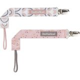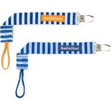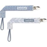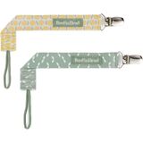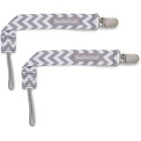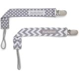 Set of two pacifier clips for ages 0-36 months that are soft and sensory against baby's delicate skin. Stylish, neutral patterns and fabrics are the perfect pacifier clips for boys or girls.
