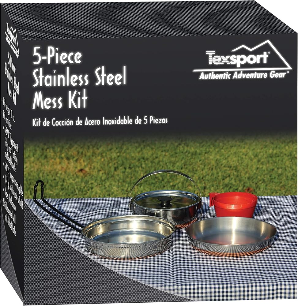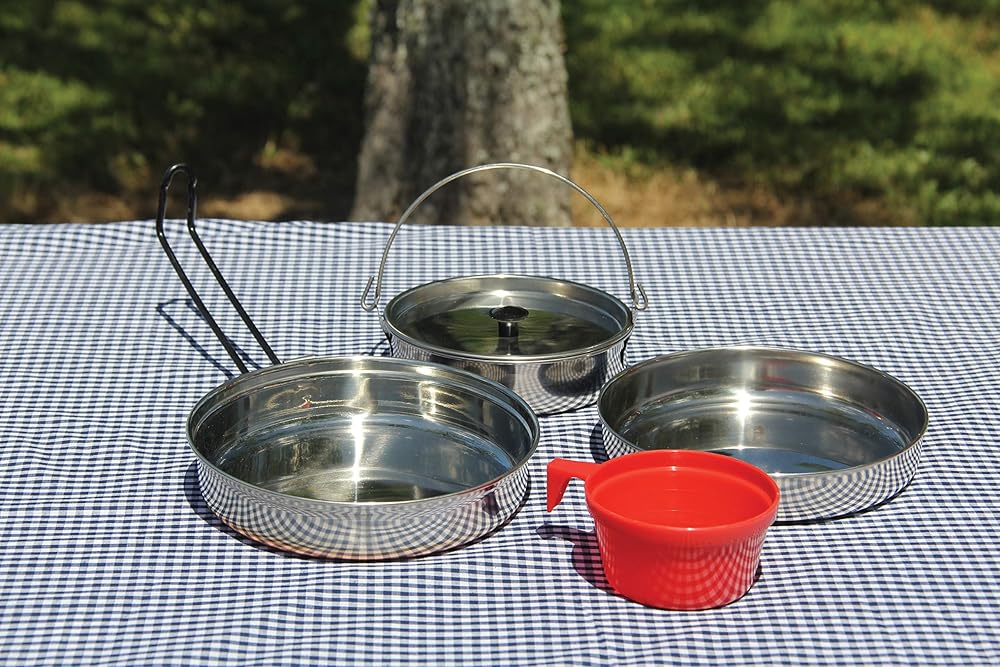 Set contains 6-1/2'' fry pan with Stay Cool locking insulated handle, 6-1/2'' fry pan cover/plate, 1/2 quart boiling pot with cover and 8 ounce plastic cup. Polished stainless steel copper bottom.