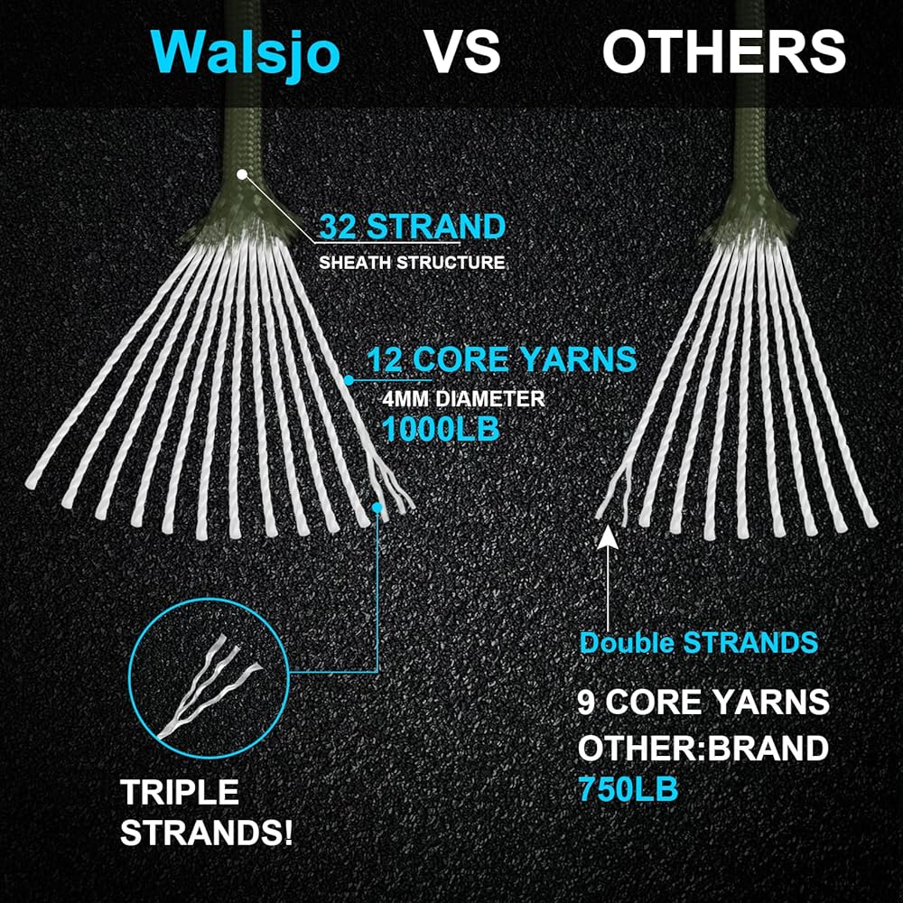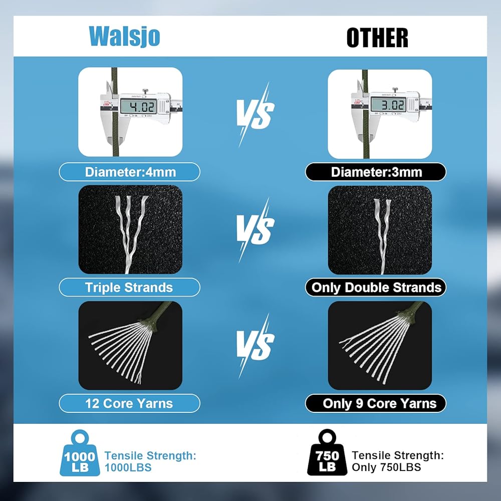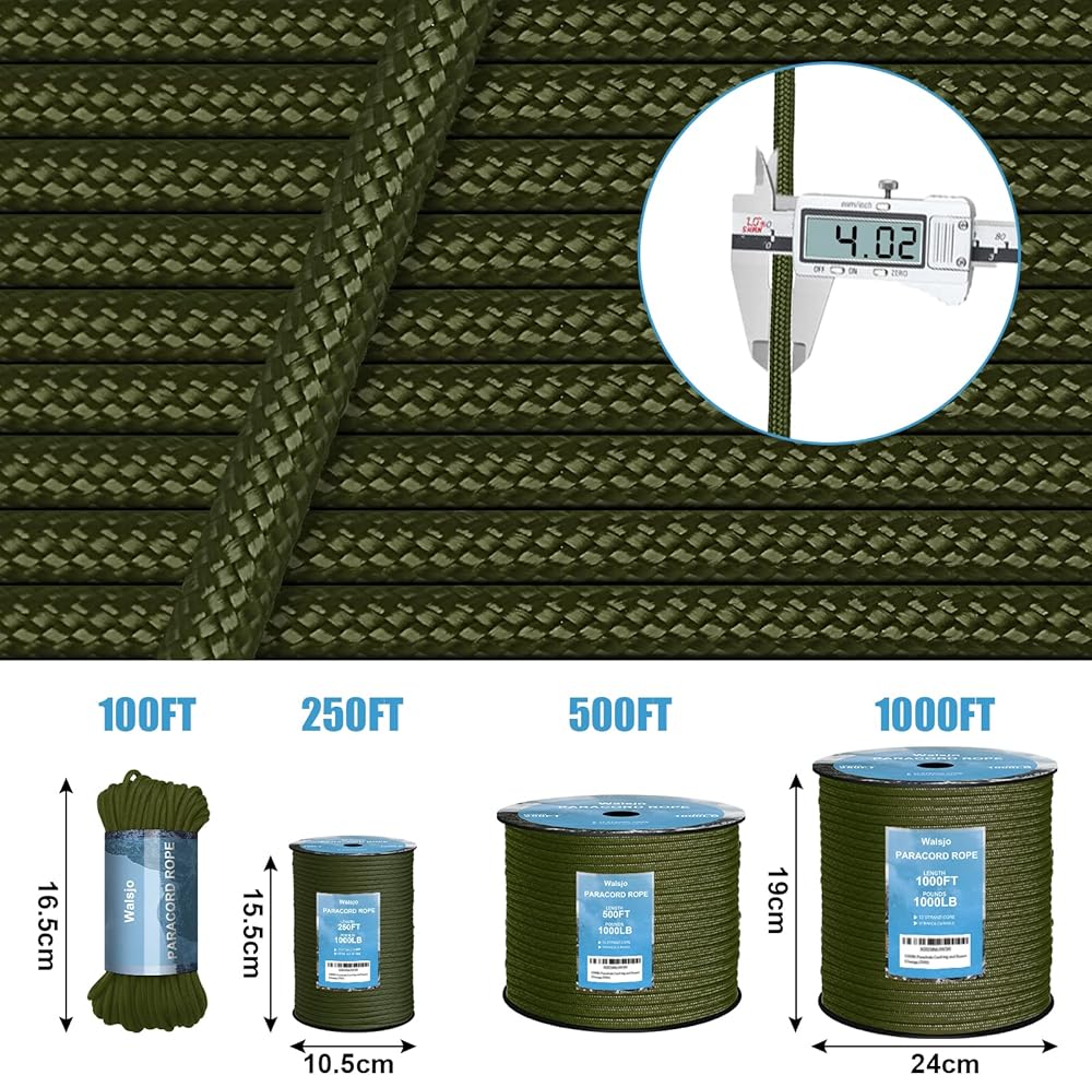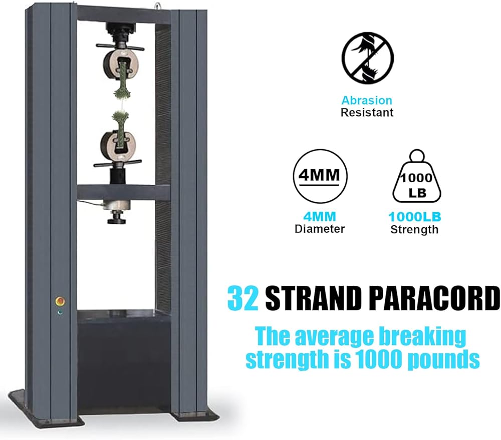 1000LB PARACORD: With an abrasion resistant 32 strand sheath structure and 12 strand inner-core 3-ply Inner Strands. The average breaking strength is 1000LBS. Compared with 750lb paracord rope, an extra 250lb breaking strength. Thickness: 5/32-inches (about 4mm). And our paracord kit has a smooth texture that doesn't fray with friction. UV and fade resistant. It's very sturdy and durable.