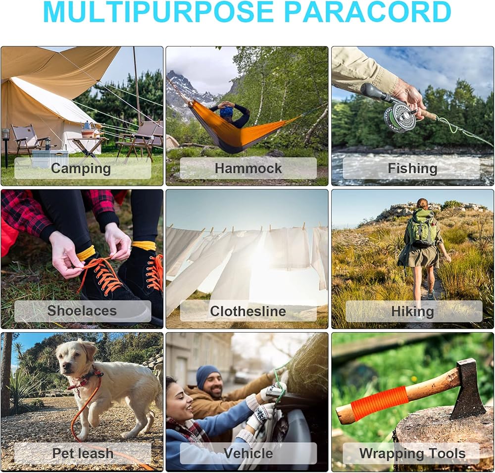 MULTIPURPOSE ROPE: The flexibility and strong strength of umbrella paracord make it very multi-functional. It is used as a tent cord to set up tents, safely secure hammock, or hang heavy items such as bikes and kayaks in your garage or basement. Serves as a safety rope in emergency situations. Ideal for crafting custom accessories: lanyards, bracelets, dog collars, keychains, belts, wrapping axes, knives, tools & other DIY projects.
